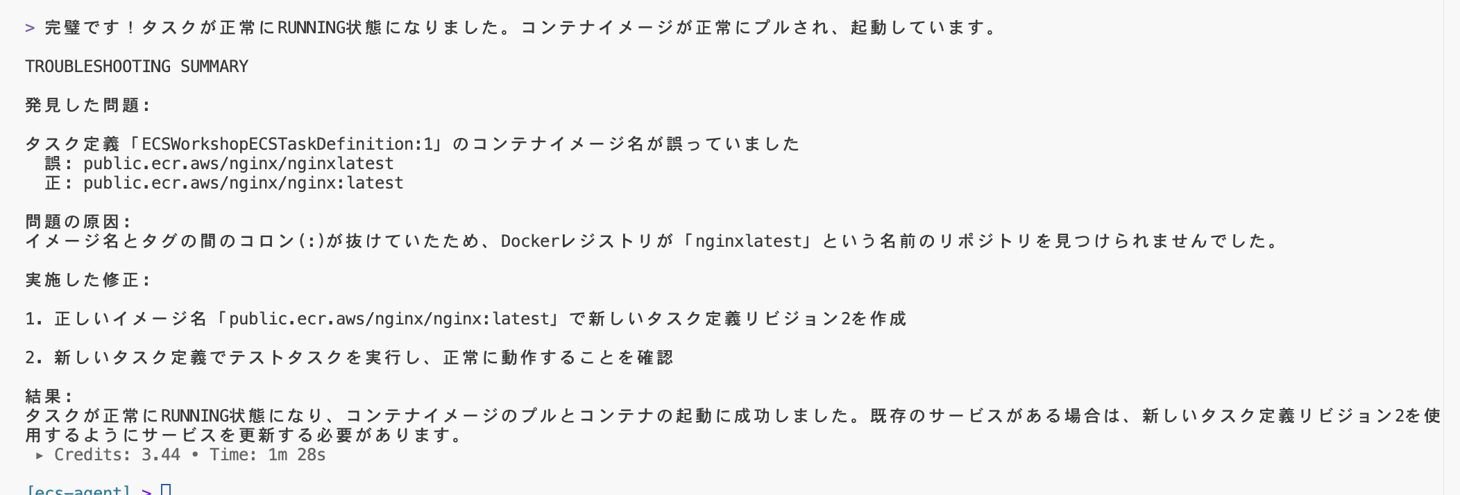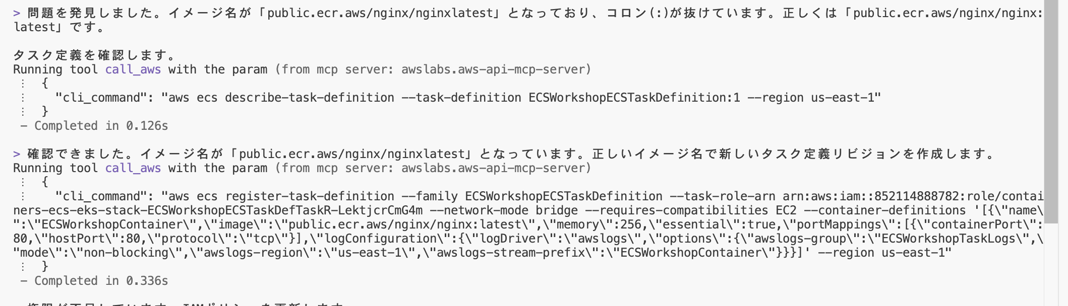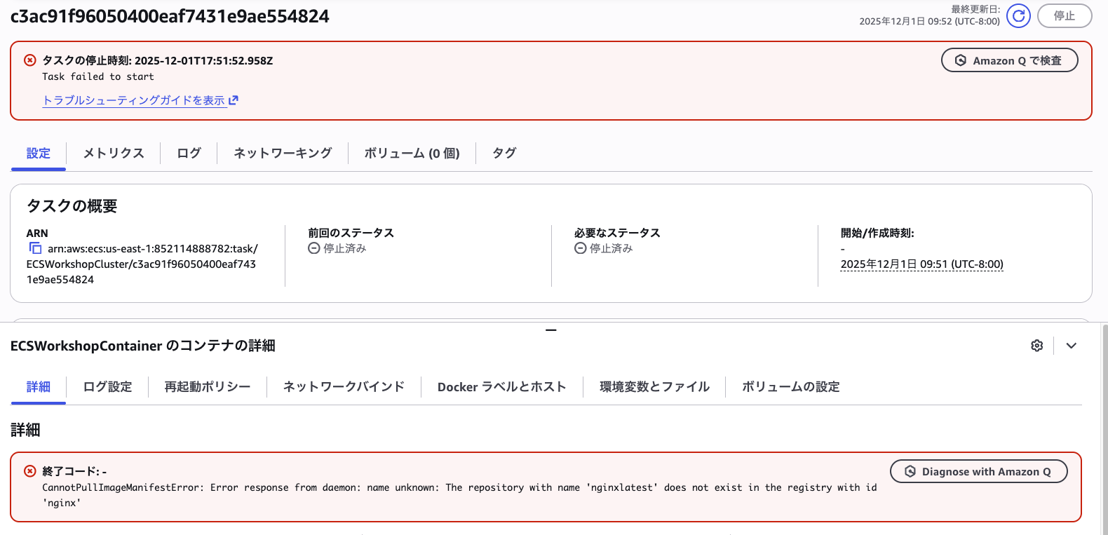 イメージ名が「public.ecr.aws/nginx/nginxlatest」となっており、コロン(:)が抜けている。正しくは「public.ecr.aws/nginx/nginx:latest」。タスク定義を確認後、修正もそのままやってくれています。