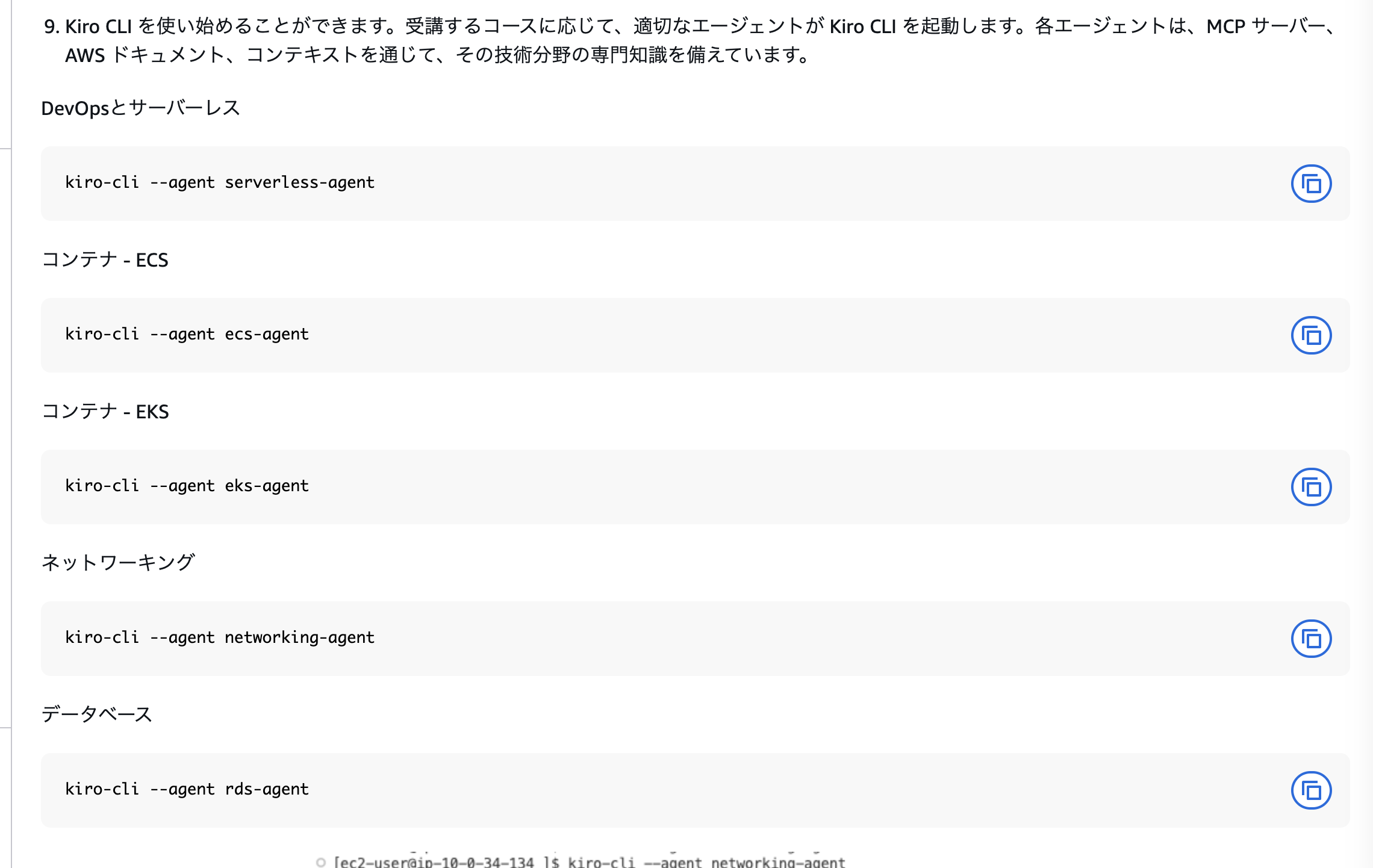 どのサービスのハンズオンをやりたいか5個から選ぶ感じで、Kiro CLI のエージェントも5個用意されていました。