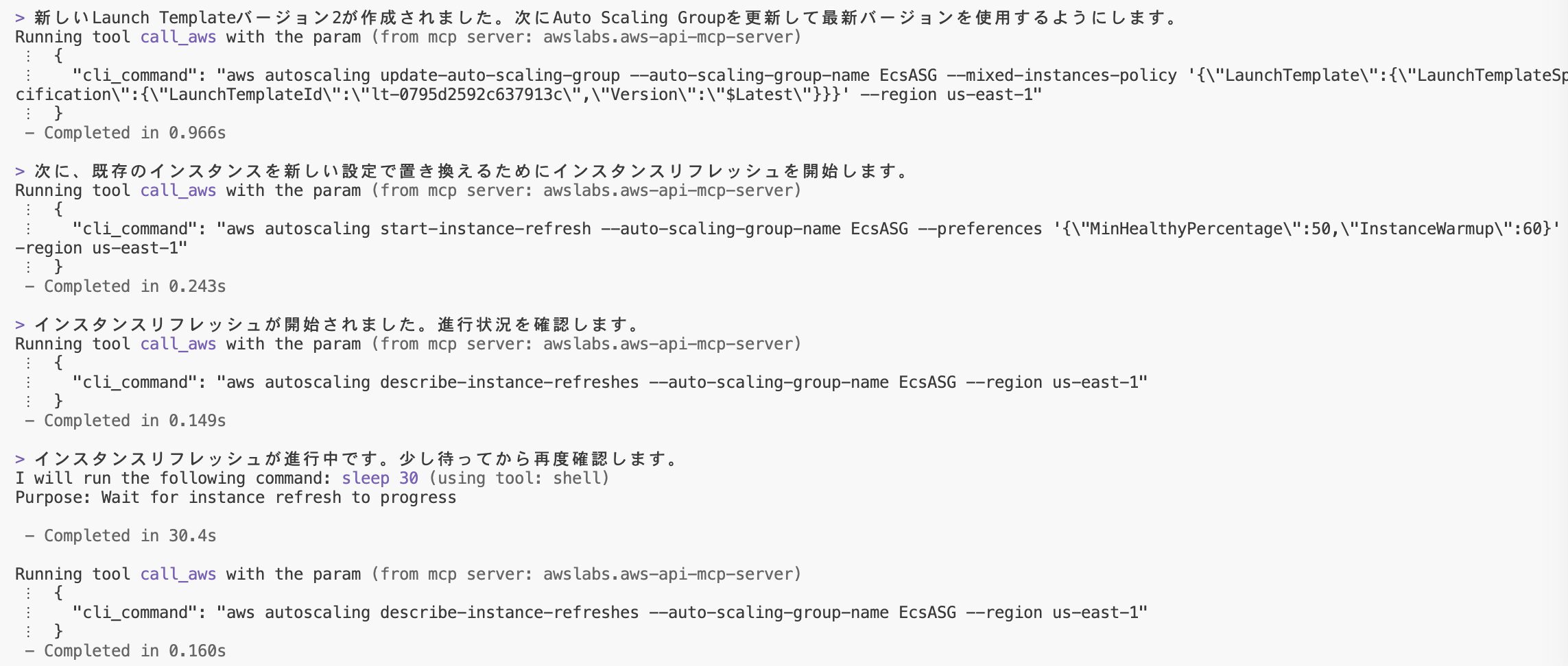 - 既存のインスタンスを新しい設定で置き換えるためにインスタンスリフレッシュを開始し、進行状況を確認。