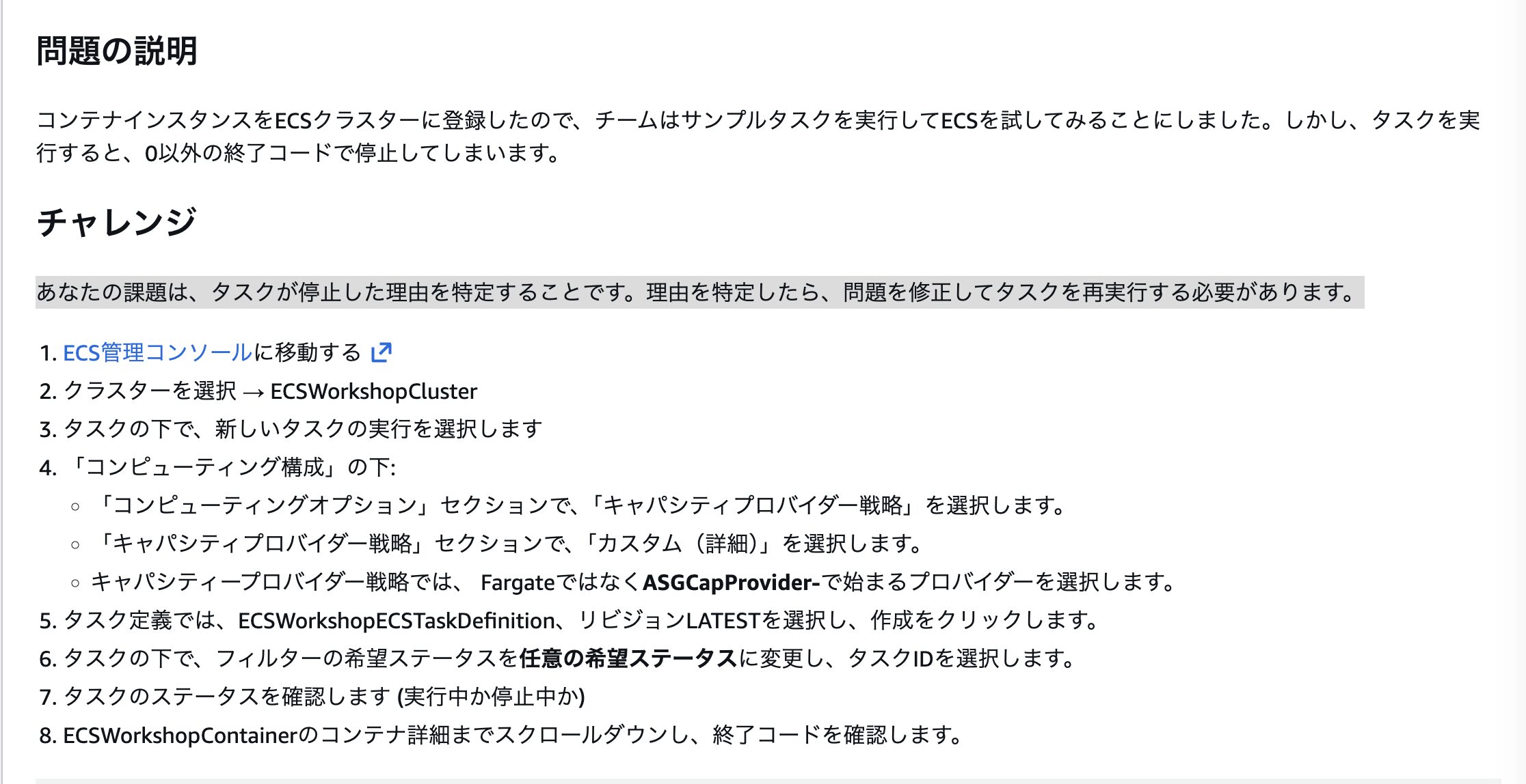 - UserDataで「ECS_CLUSTER=’Empty’」と設定されており、正しいクラスター名「ECSWorkshopCluster」に修正する必要がある。