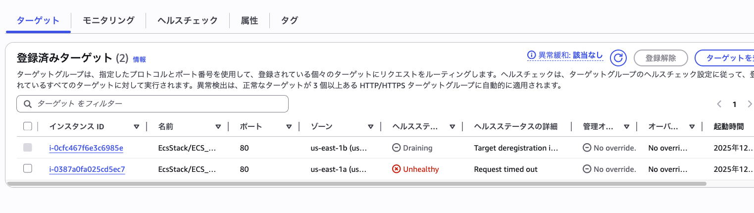 ターゲットグループの状態確認画面。登録済みターゲット2つのうち、1つは「Draining」ステータスで「Target deregistration in progress」、もう1つは「Unhealthy」ステータスで「Request timed out」と表示。異常検知として「該当なし」と表示されている。