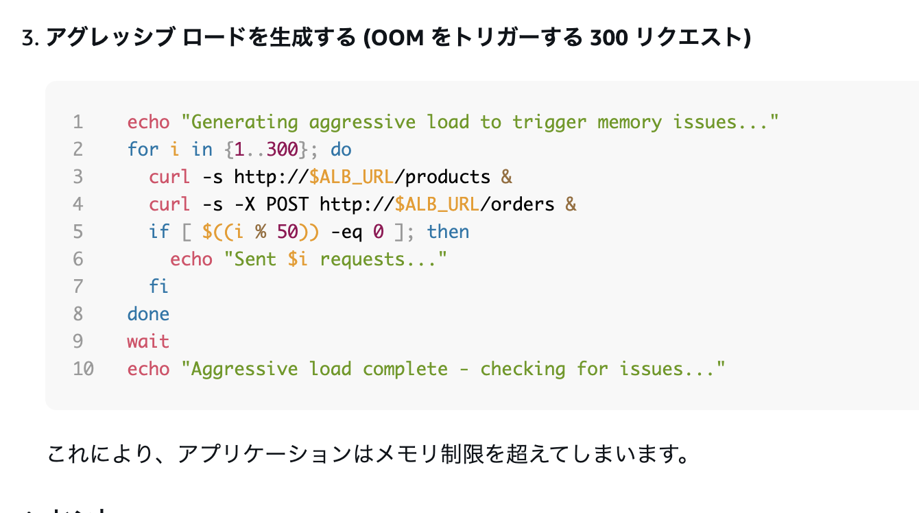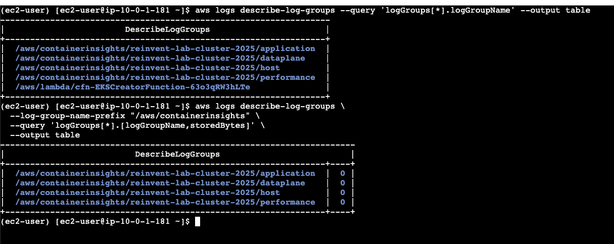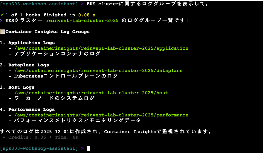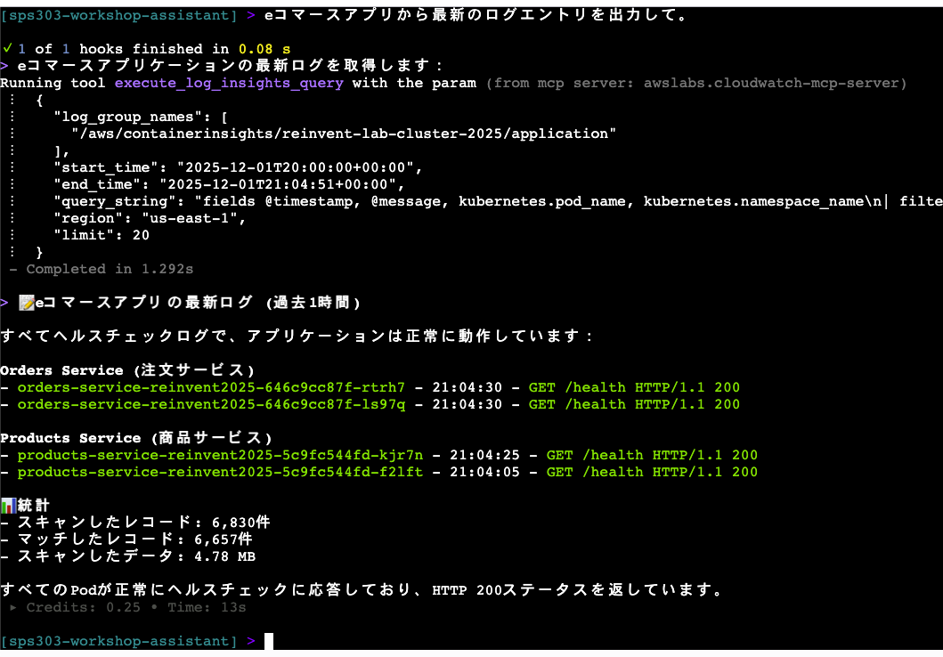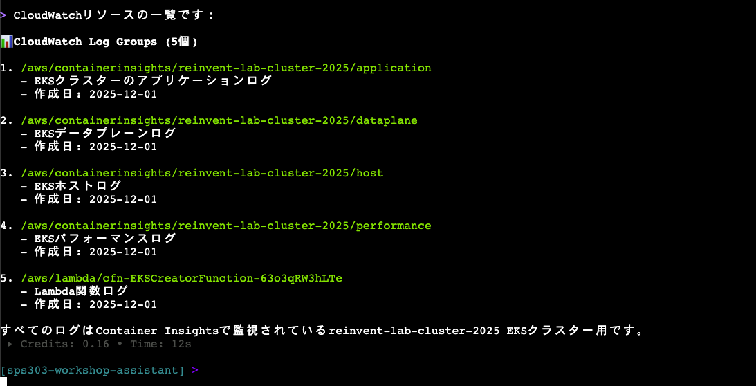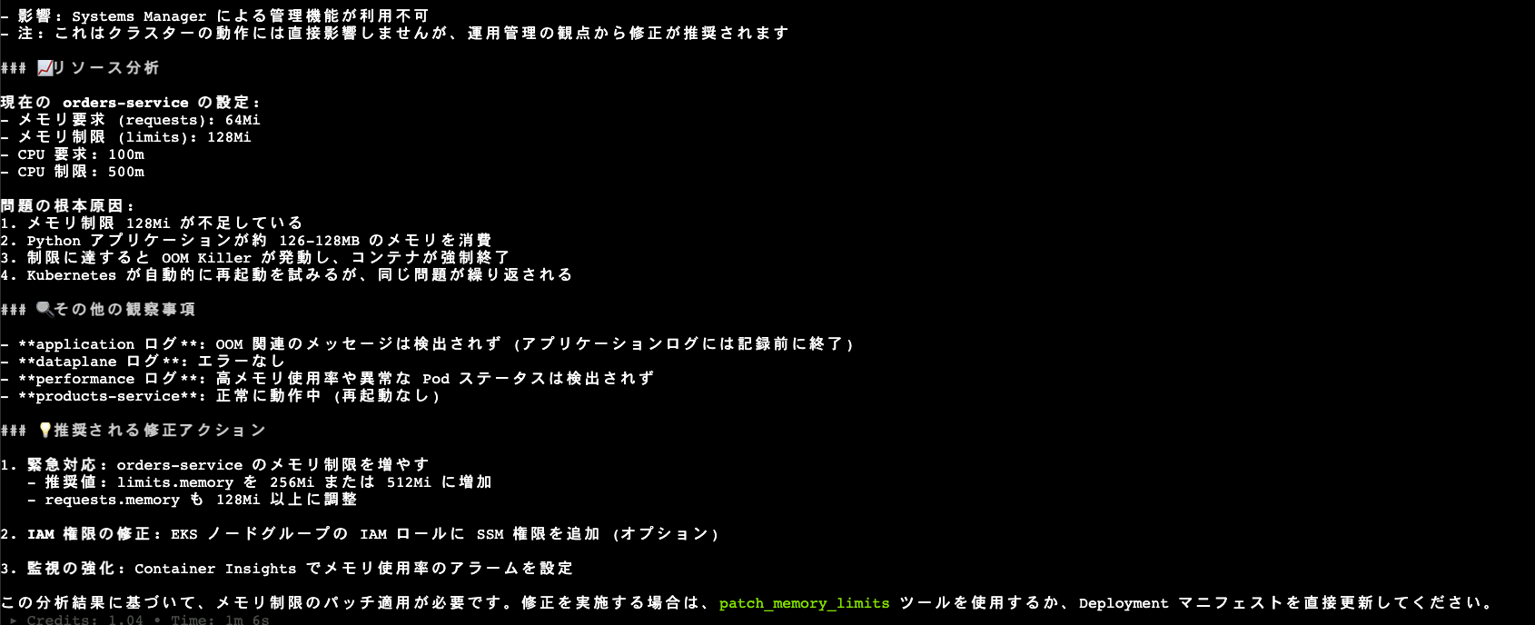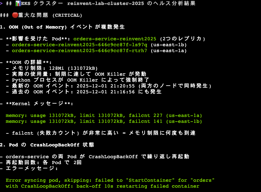 「CloudWatch を使用して、私の EKS クラスター reinvent-lab-cluster-2025 のヘルスを分析してください。コンテナインサイトで OOM (メモリ不足) イベント、Pod の失敗、およびリソースの問題を確認してください。また、コントロールプレーンログでクラスターレベルの問題がないか調べ、host、application、dataplane、performance の全てのロググループで包括的なチェックを実行してください。問題の修正(パッチ適用)は行わず、問題点を指摘してください。」