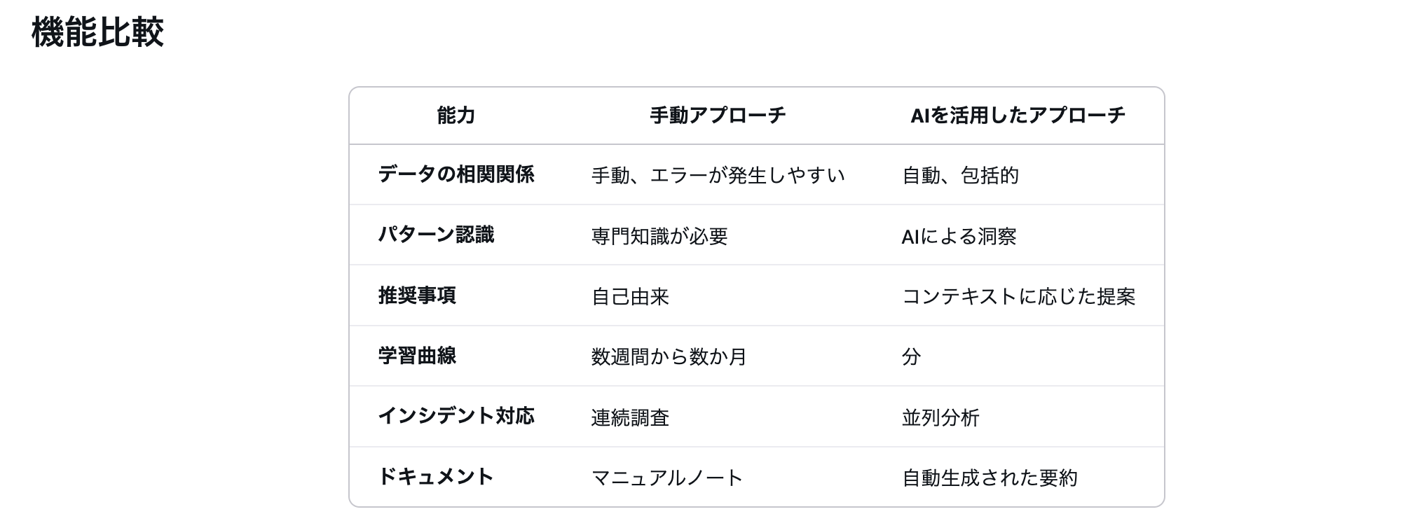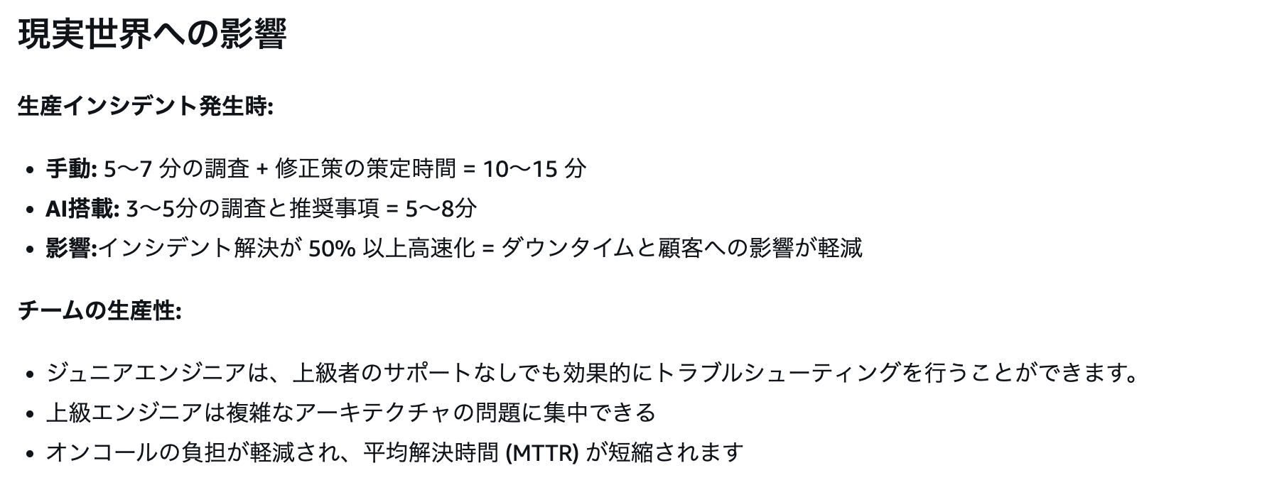 ログやリソース名などの環境固有の情報を自然言語で調べられるのがとても便利だと思います。