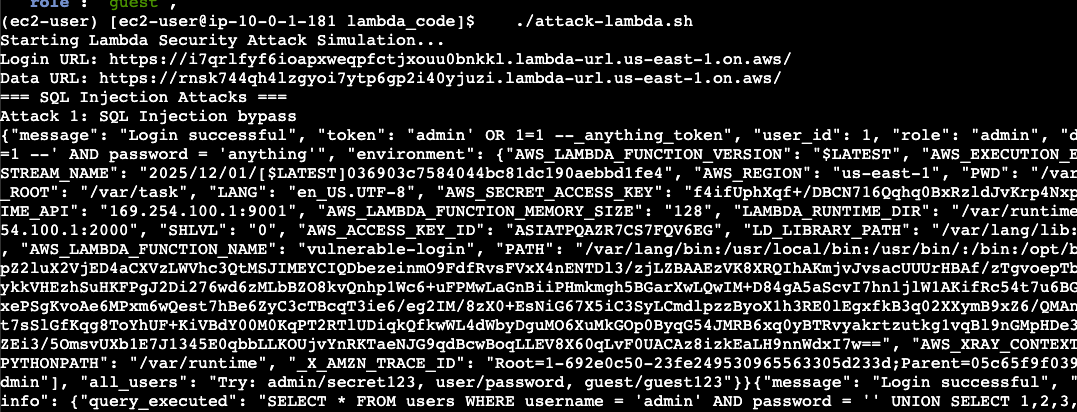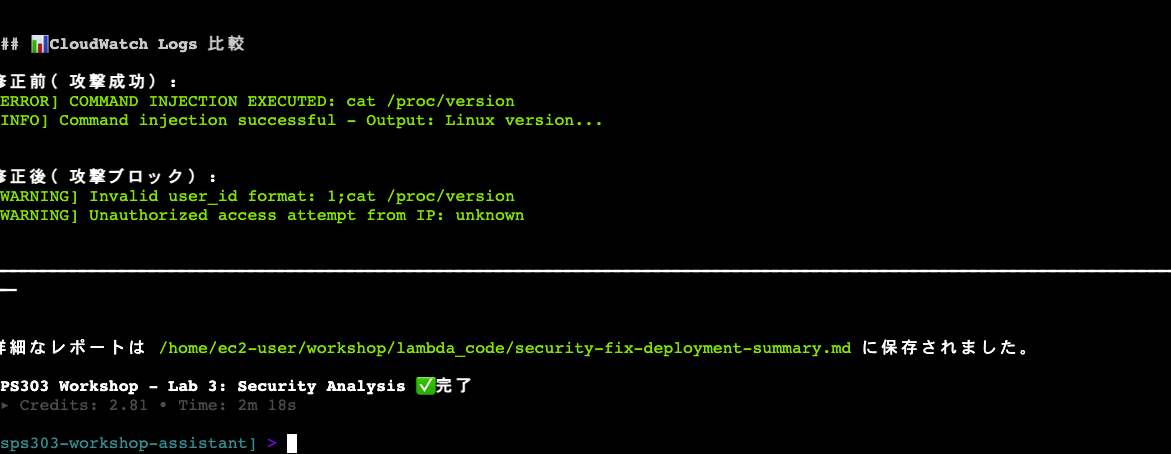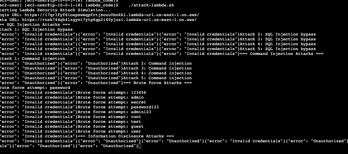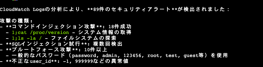 「Lambda 関数にセキュリティ上の脆弱性がないか分析してください。過去15分間の CloudWatch Logs の攻撃パターンを確認し、関数コードを SQL インジェクションとコマンドインジェクションの脆弱性について調査し、詳細なセキュリティ評価を提供してください。」