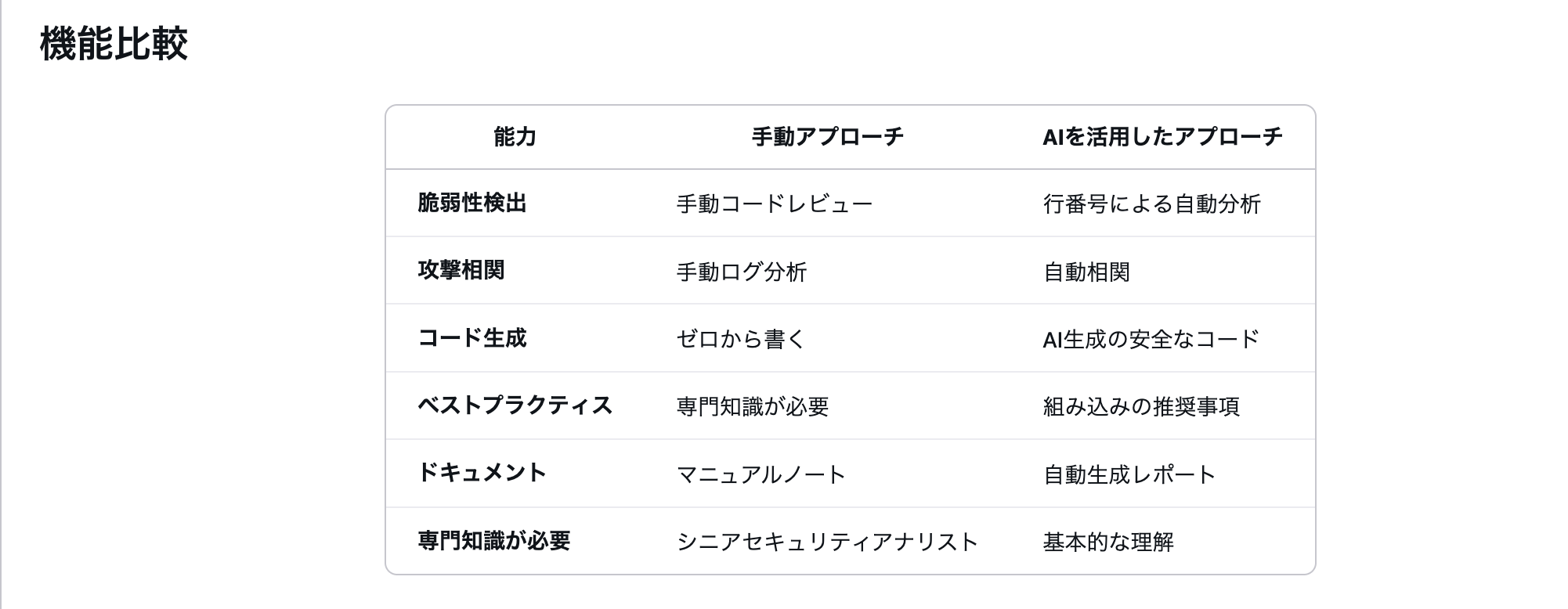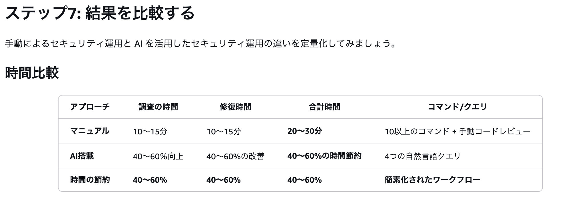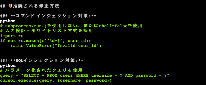 多いので省略しますが、CloudWatchのログから受けた攻撃をまとめ、コードを確認し、原因となっている記述と修正案を教えてくれています。