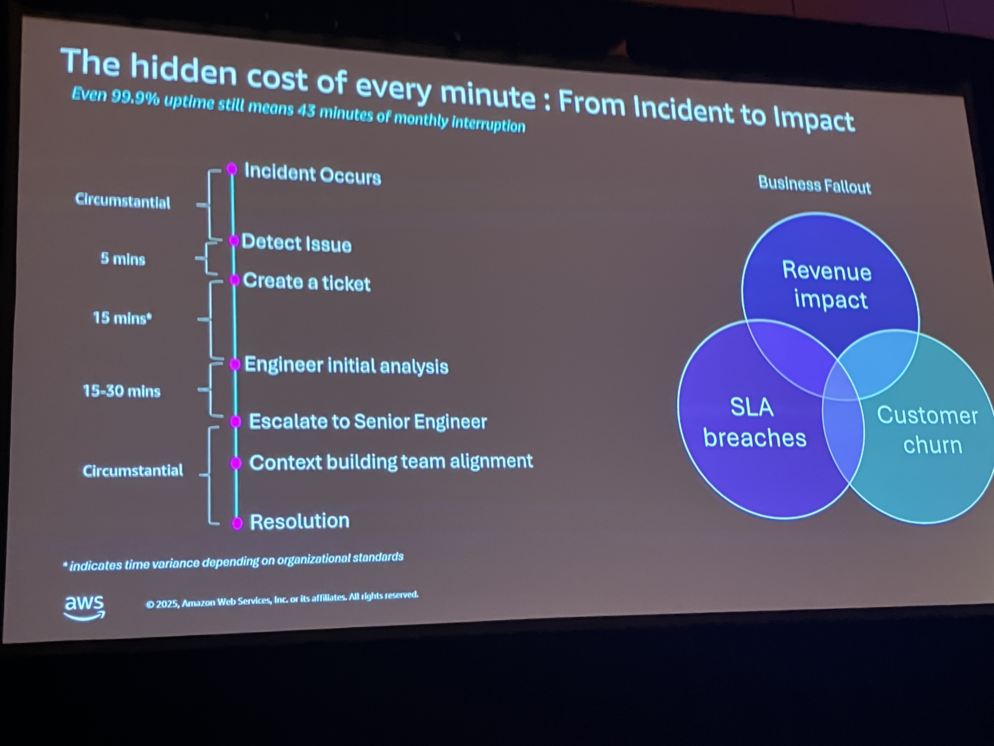インシデントが発生してから検知され、チケットが作成された後、エンジニアへの引き継ぎ、複数のチームや上級エンジニアを経由する調査を経て解決に至るプロセス全体に、通常30分以上かかる。