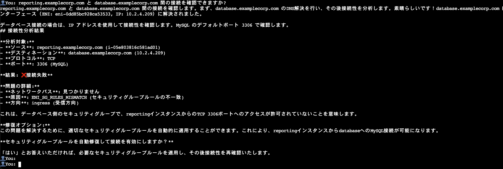 エージェントは、ホスト名から名前解決を行い、ネットワークの接続を分析し、修正を提案してくれました。