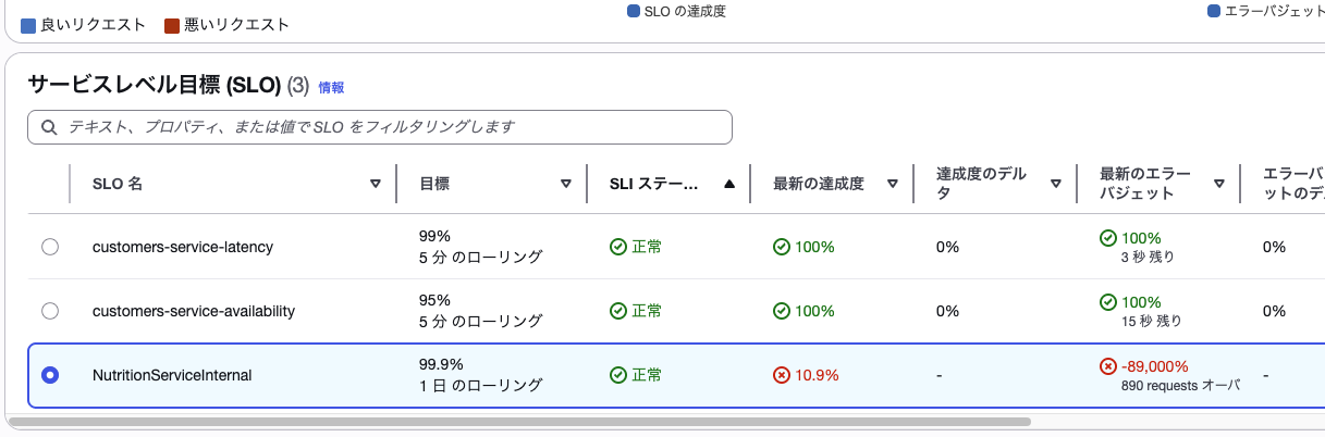 作成後、SLO パフォーマンスが低下し、エラー バジェットが消費されることがわかります。