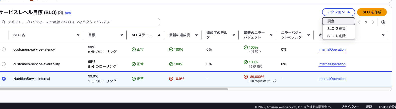 SLO を選択した状態で、[アクション] > [調査]をクリックします。