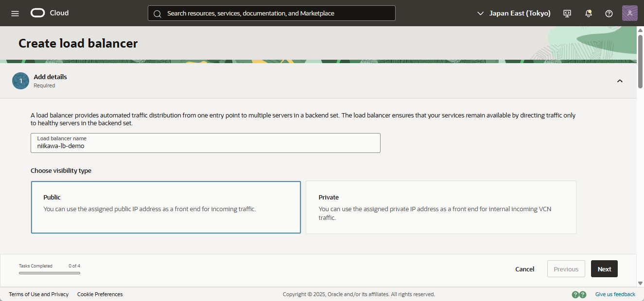 - 「Load balancer name」を入力、「Choose visibility type」に「Public」、「Assign a public IP address」に「Ephemeral」を選択します。