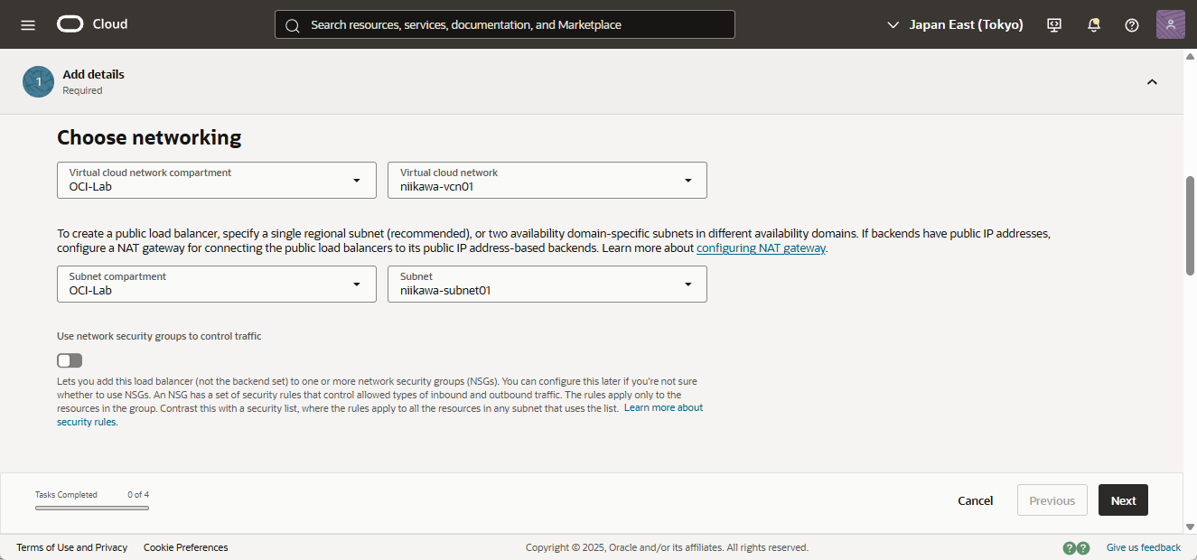 - ロードバランサーを配置するネットワークを設定します。Virtual cloud network、Subnet を選択します。作成済みのVCN、パブリックサブネットを選択します。