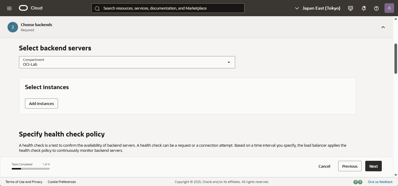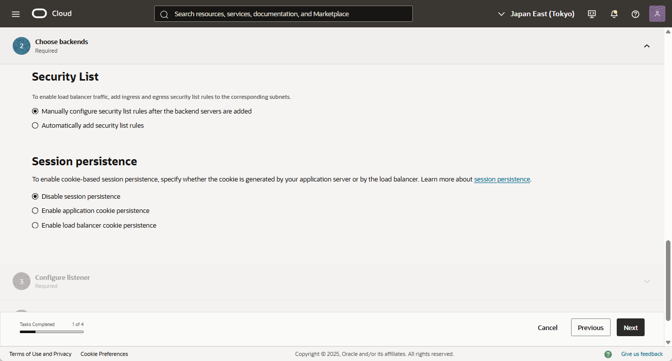 - Security List は、先ほど設定済みのため、「Manually configure security list rules after the backend servers are added」を選択します。
