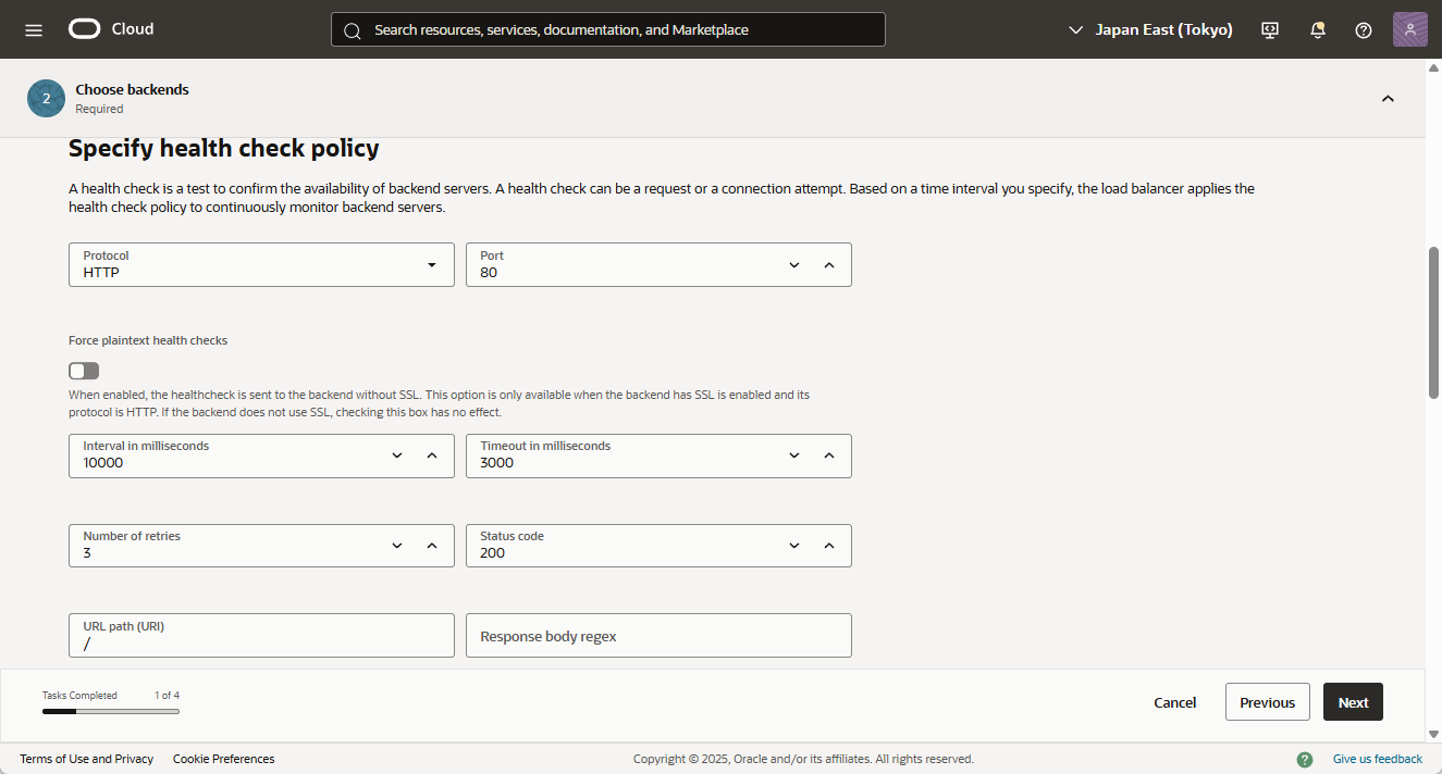 - Health check policy は、「Protocol」に「HTTP」、「Port」に「80」が選択されていることを確認します。その他の設定はデフォルトで構いません。