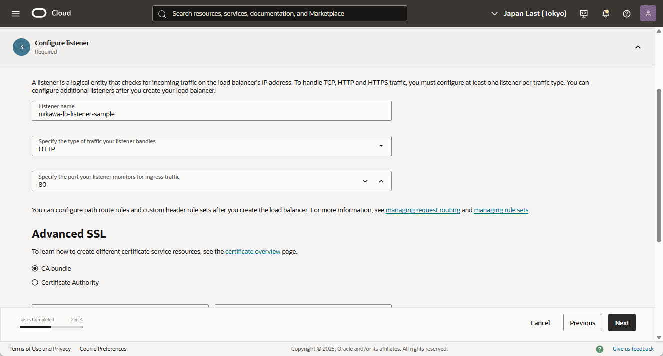 - 「Listener name」を入力します。「Specify the type of traffic your listener handles」に「HTTP」、「Specify the port your listener monitors for ingress traffic」に「80」が選択されていることを確認します。
