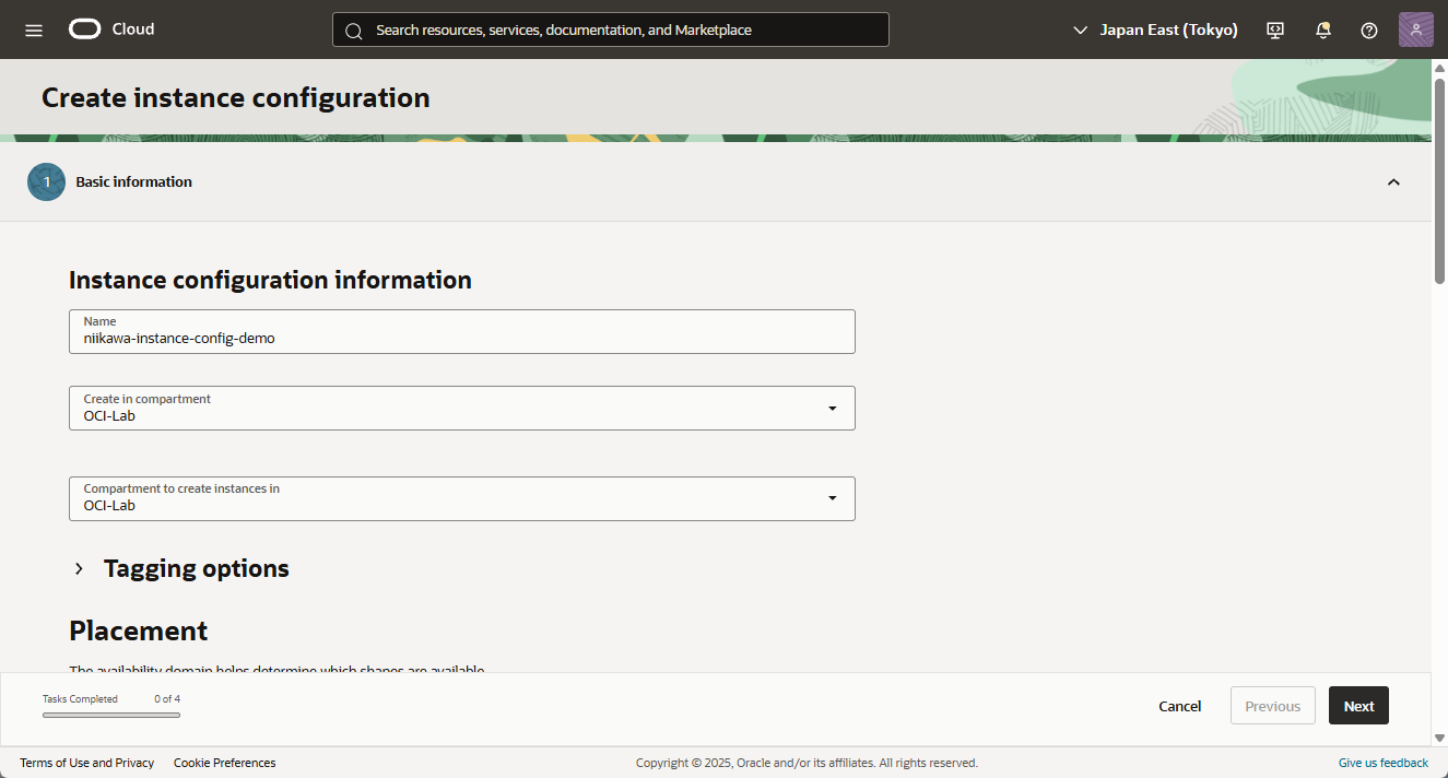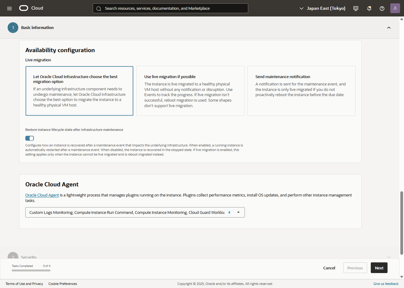 - Availability configuration、Oracle Cloud Agent は、デフォルト通り選択します。「Next」を選択します。