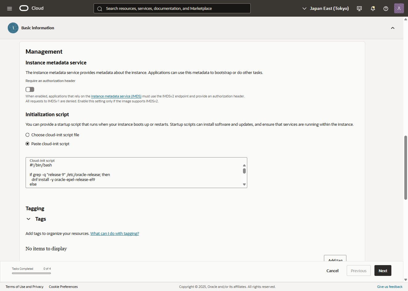 - 「Initialization script」に後述のCloud-init スクリプトを貼り付けます。