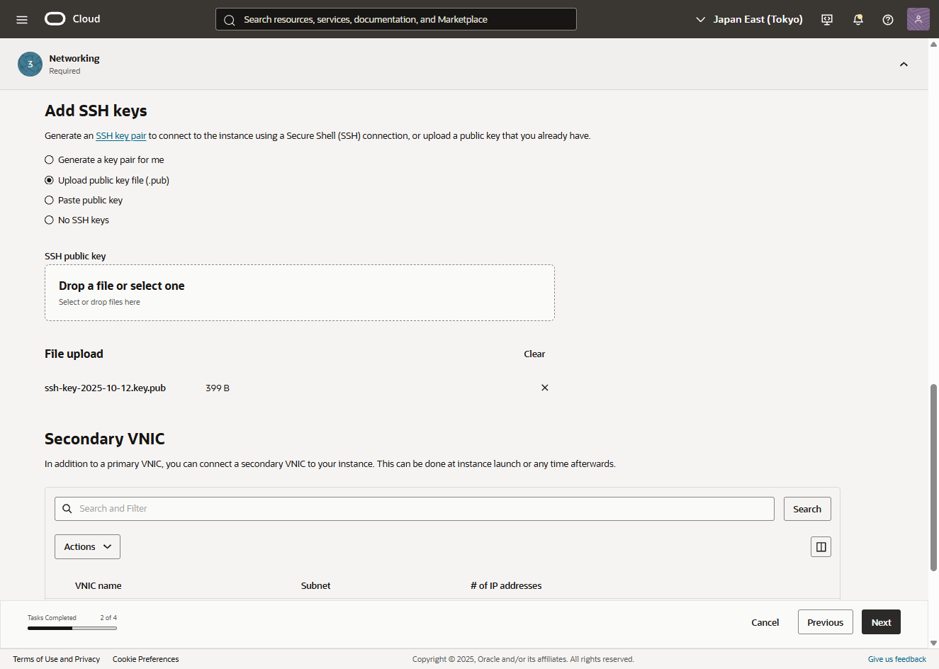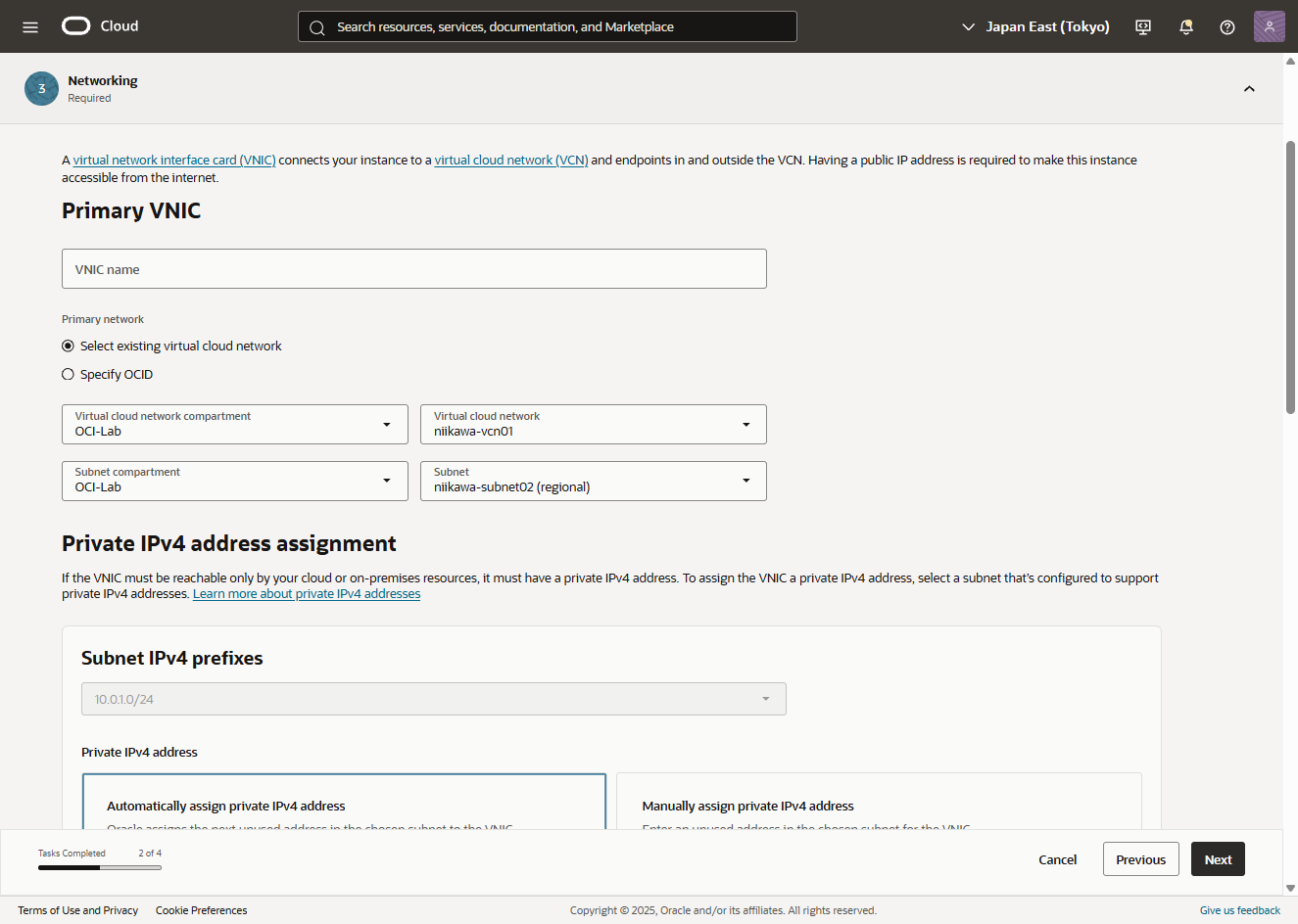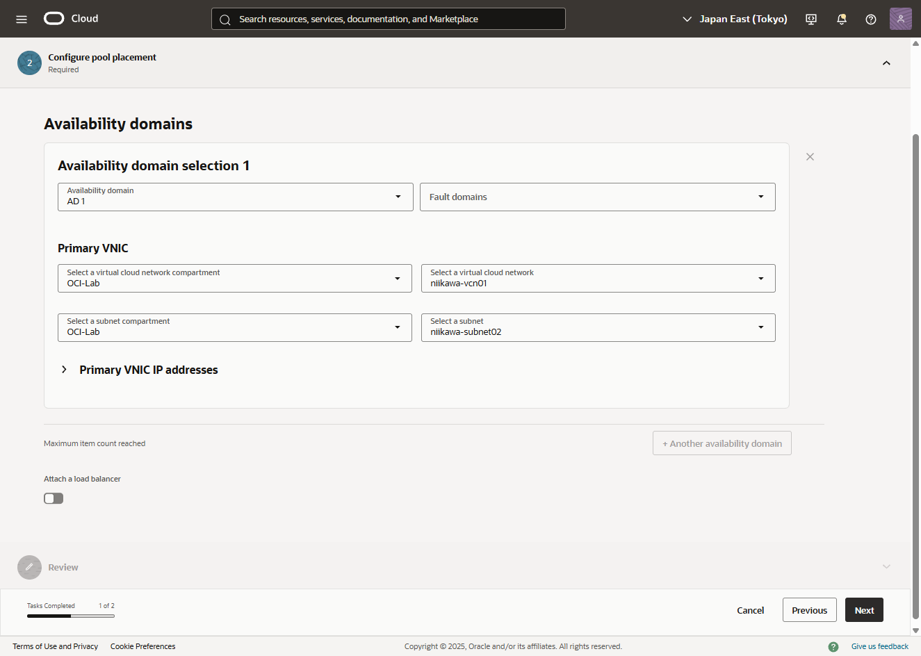 - Availability domains において、Primary VNIC の設定を行います。