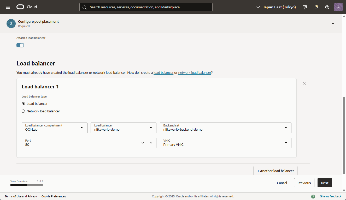 - 「Attach a load balancer」を有効にし、「Load balancer type」に「Load balancer」を選択、「Load balancer」、「Backend Set」に作成済みのロードバランサー、バックエンドを選択、「Port」に「80」を選択します。「Next」を選択します。