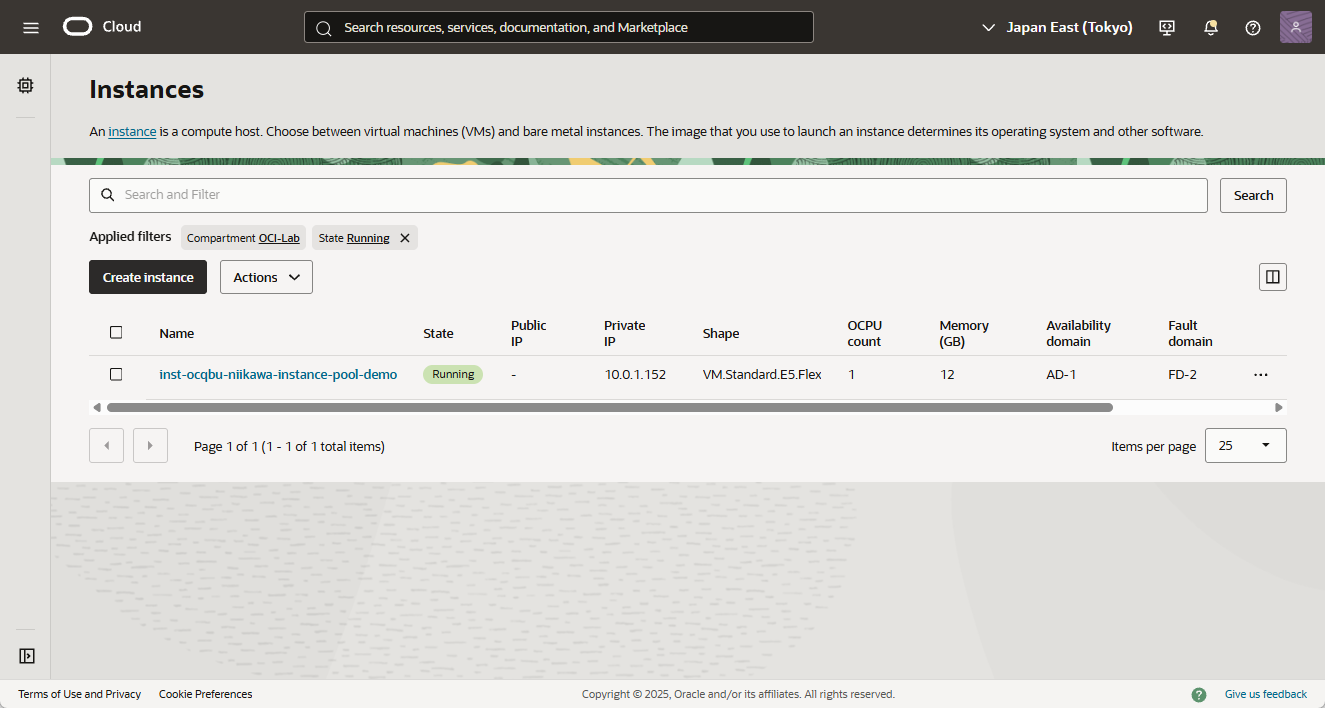 - 以下の画像は、ナビゲーション・メニューから「Compute」→「Instances」を選択した画面です。