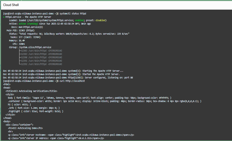 - インスタンス OS にssh接続後、以下のように、httpdサービスがインストールされサービスが起動していること、localhost にcurl を行ってhtml が返ることを確認します。