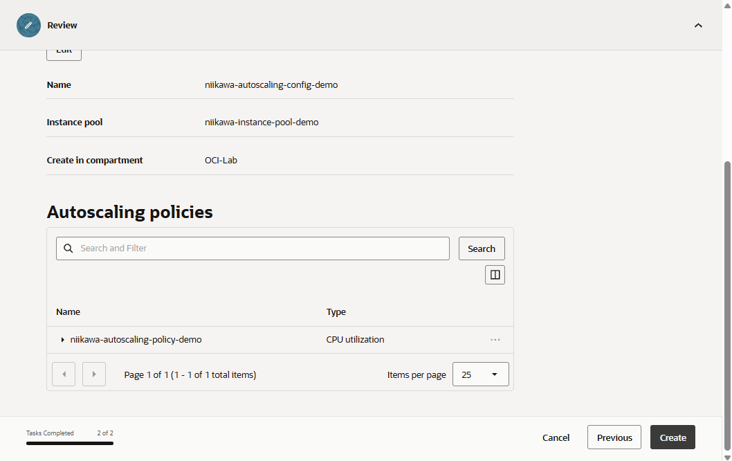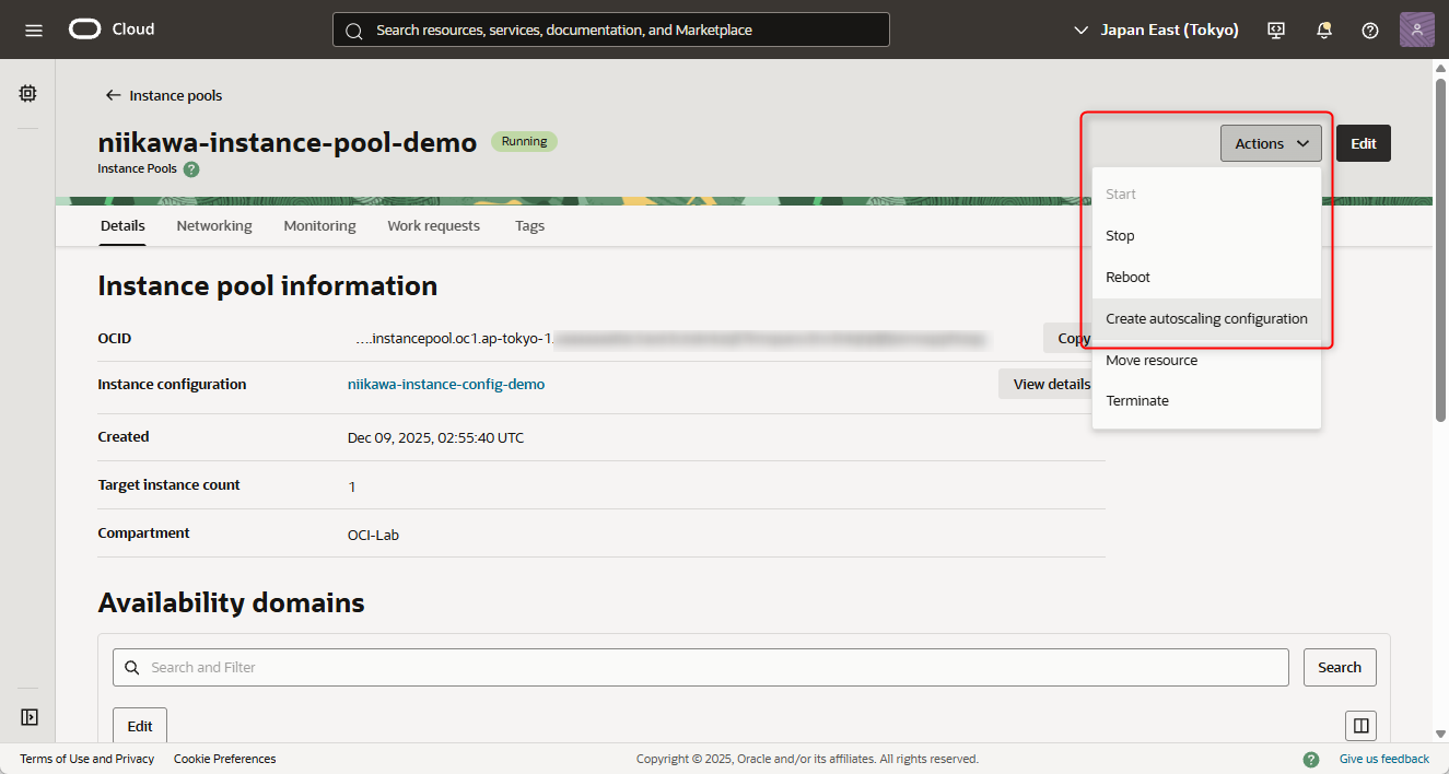 - OCIの管理コンソールにて、インスタンスプールが選択された状態から、「Actions」→「Create autoscaling configuration」を選択します。