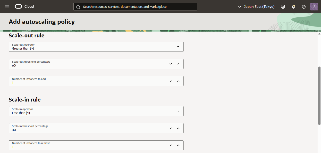 - 「Scale-out operator」に「Greater than (>)」選択、「Scale-out threshold percentage」に「60」、「Number of instances to add」に「1」を指定します。