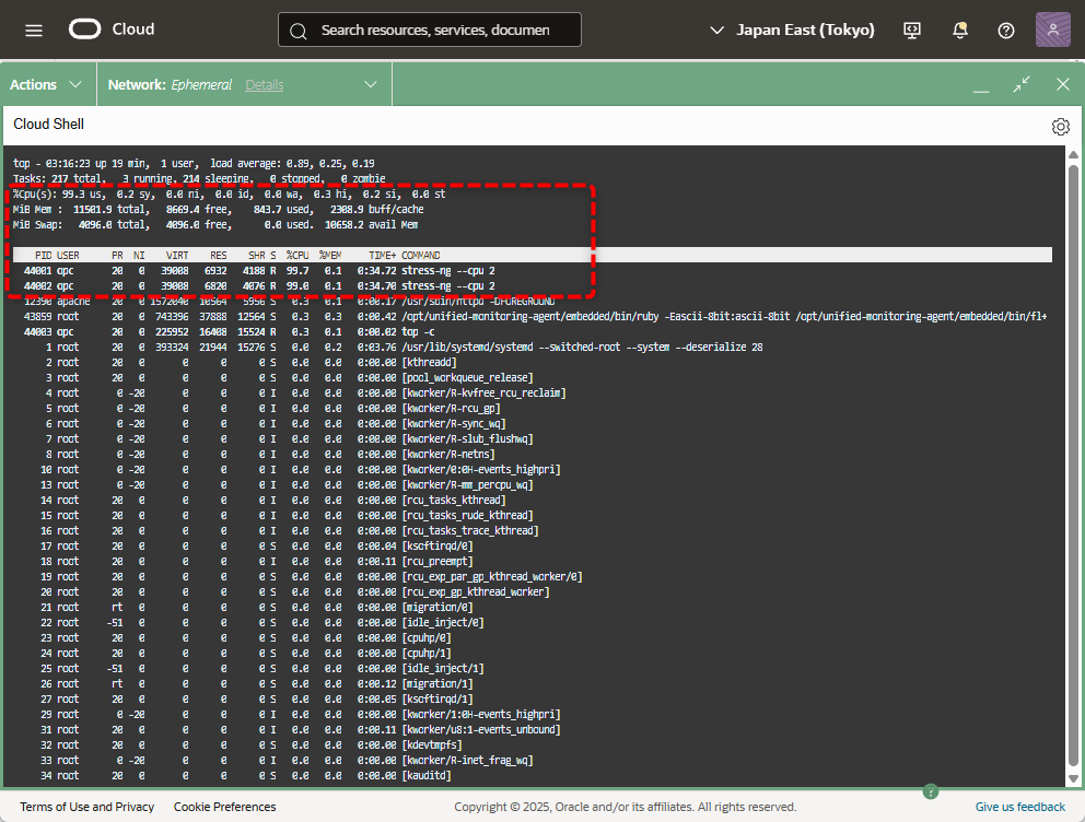 - cpuオプションで負荷をかけるワーカープロセスの数を指定します。インスタンスのOCPU数に合わせて、変更します。