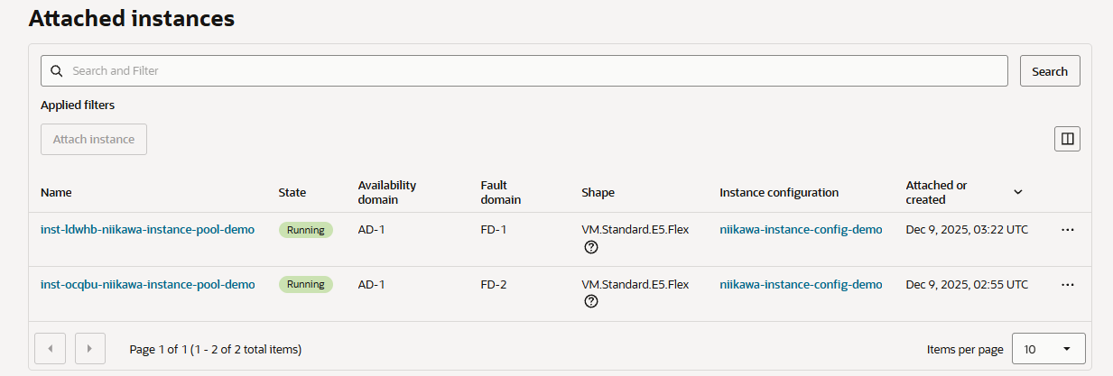 - 次に、「Details」を選択し、「Attached instances」を確認します。スケールアウトのルールに合致したため、インスタンスが1台から2台に増えたことが確認できます。