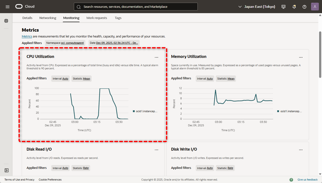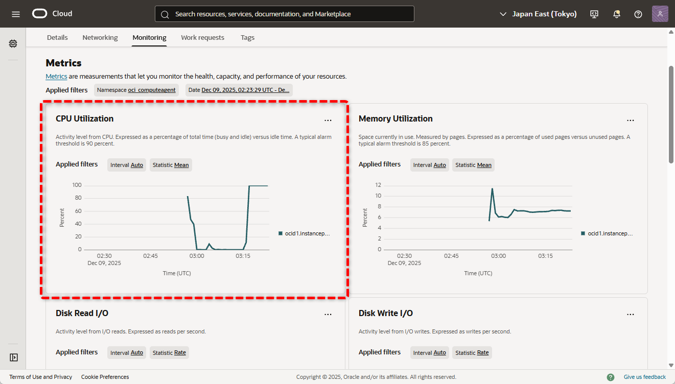 - メトリクスのCPU Utilization を確認します。メトリクスからもCPU使用率が約0% に戻ったことが確認できます。