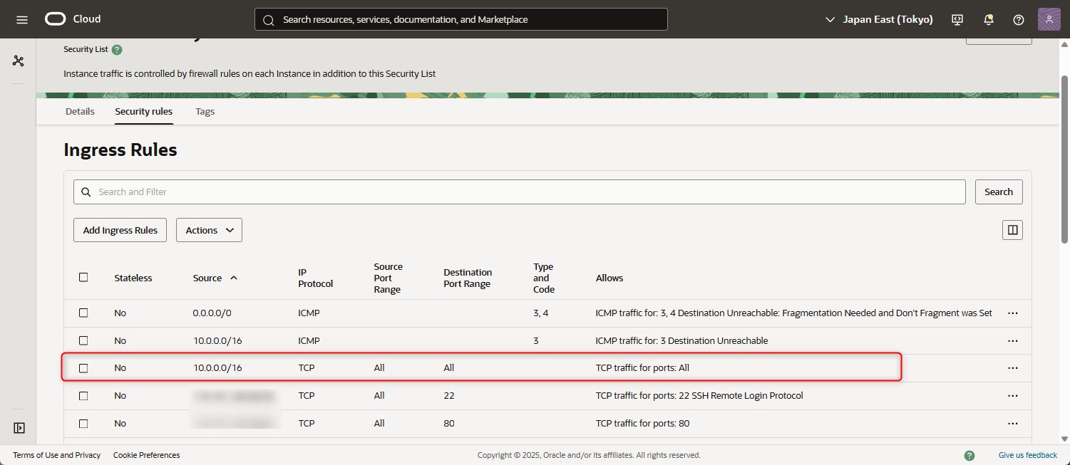 - 次に、セキュリティリストのSecurity rules を確認します。今回は、以下のようにVCN のCIDR内の通信を許可するIngress Ruleを追加しております。