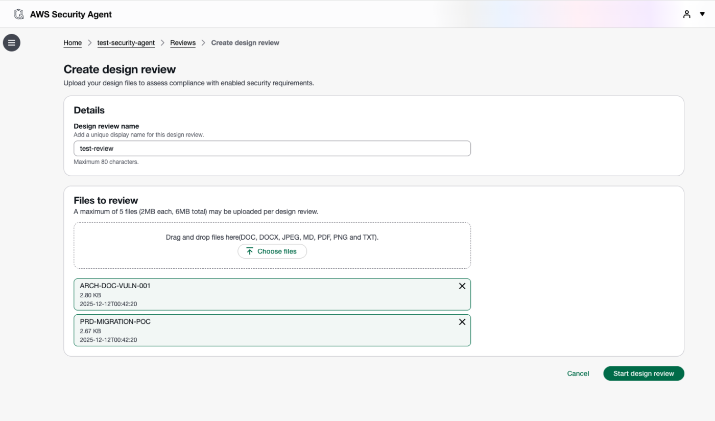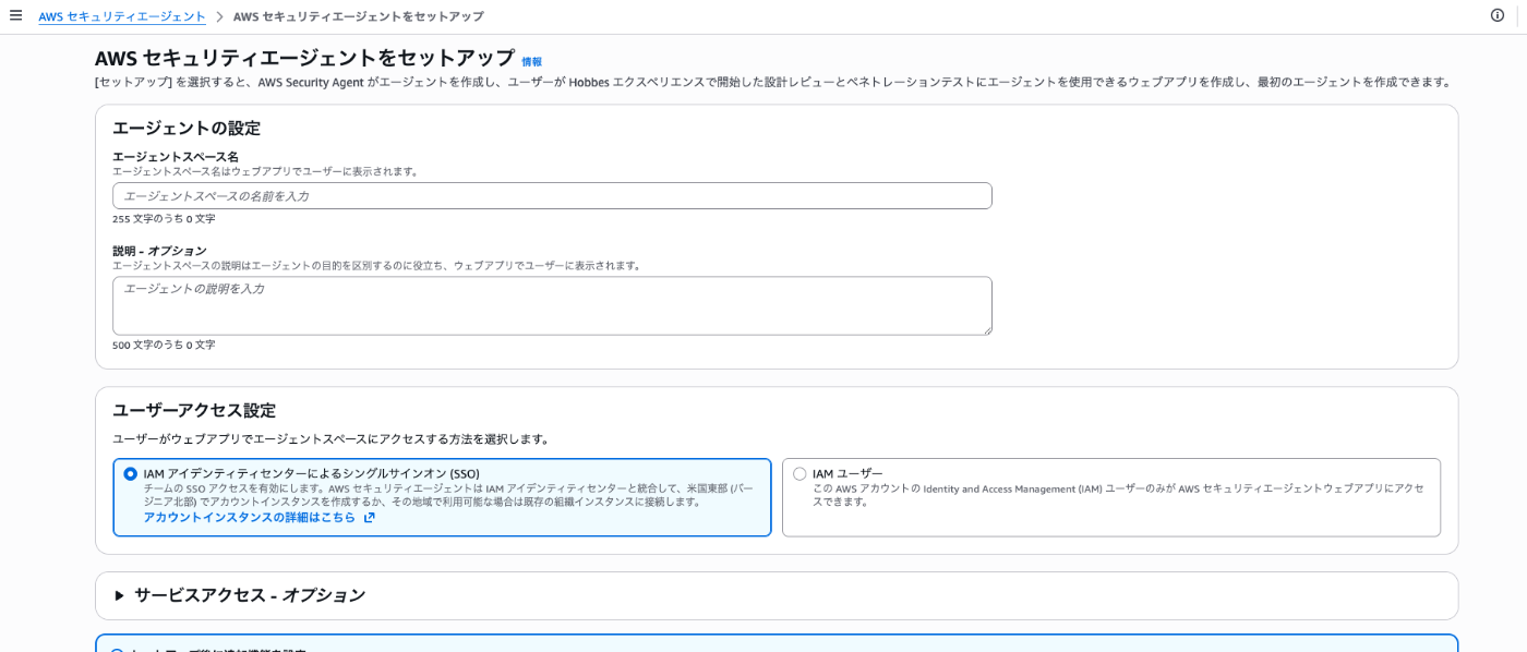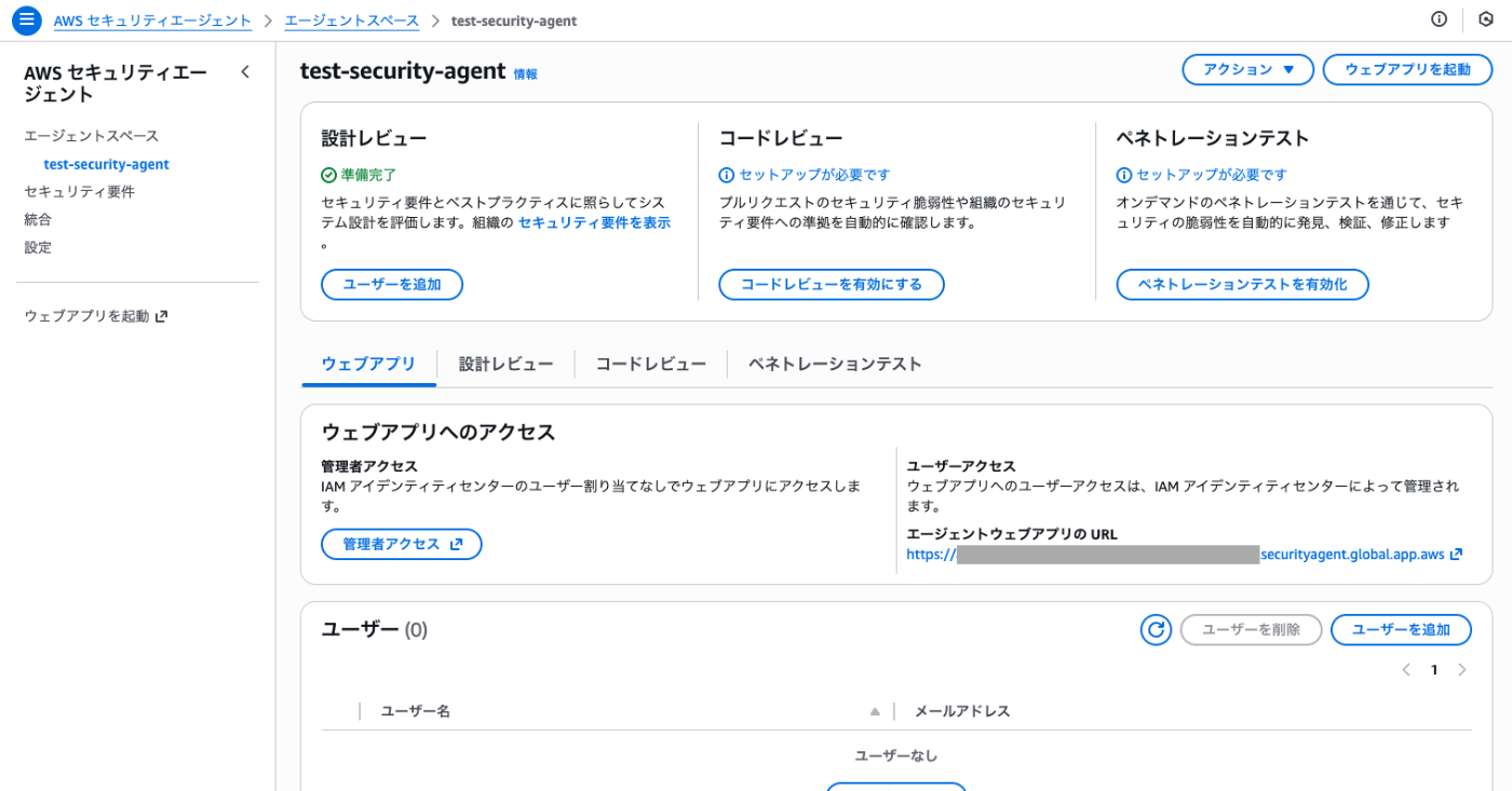 Webアプリケーションを表示すると、AWS Security Agent の画面が表示されます。