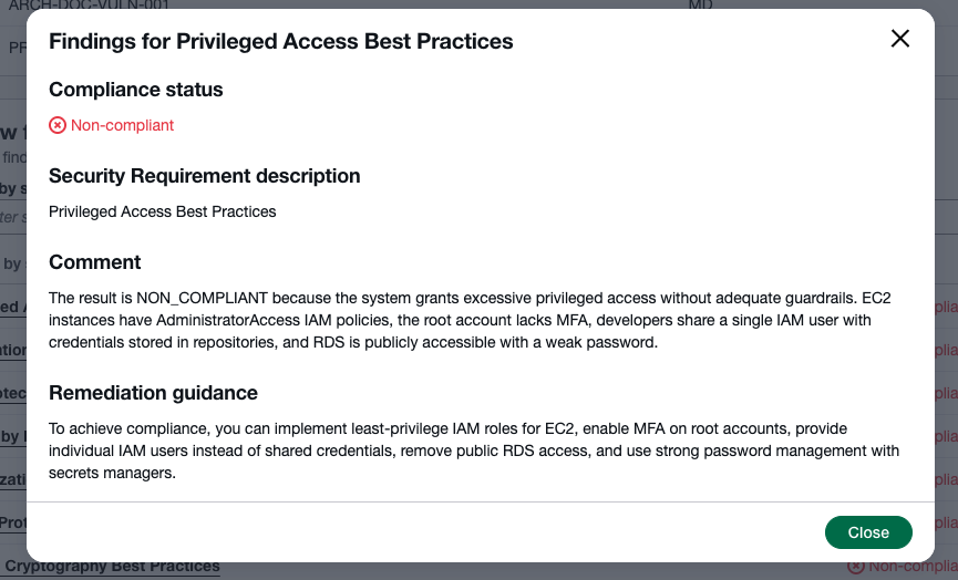 システムが適切なガードレール(保護措置)なしに過剰な特権アクセスを許可しているため、結果は NON_COMPLIANT(非準拠) です。具体的には、EC2インスタンスに AdministratorAccess IAMポリシーが付与されていること、ルートアカウントにMFA(多要素認証)がないこと、開発者が単一のIAMユーザーを共有し認証情報をリポジトリに保存していること、そしてRDSが脆弱なパスワードでパブリックアクセス可能な状態であることが挙げられます。修復ガイダンス