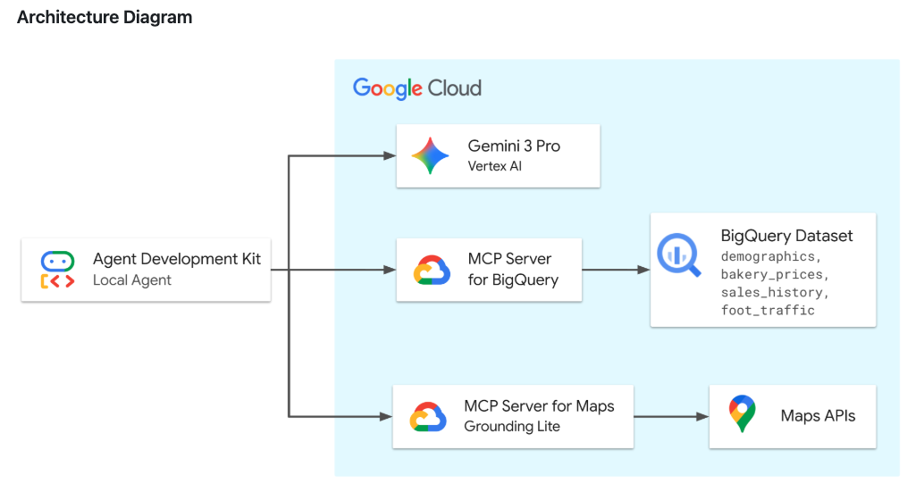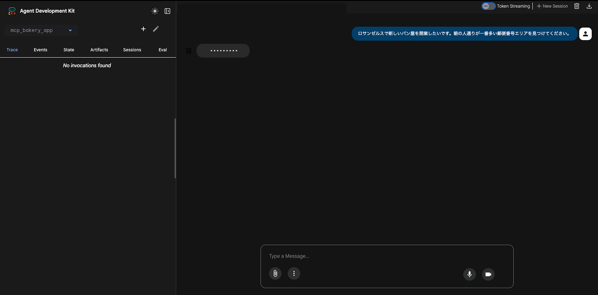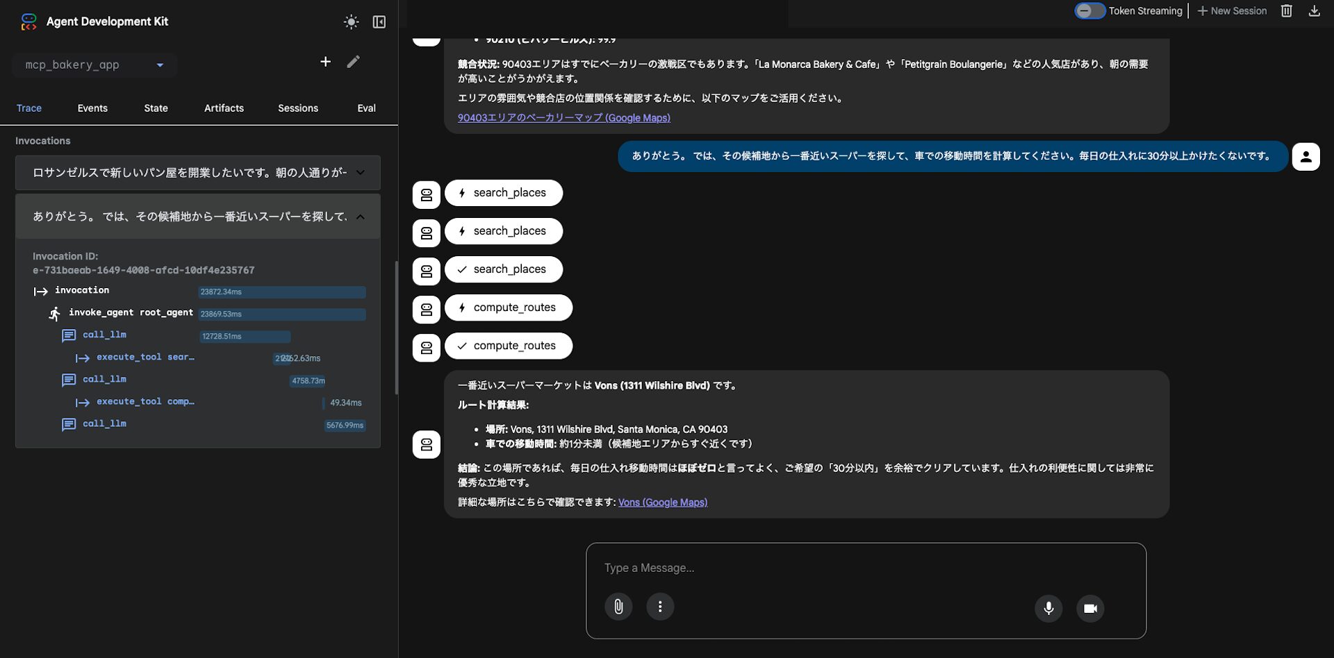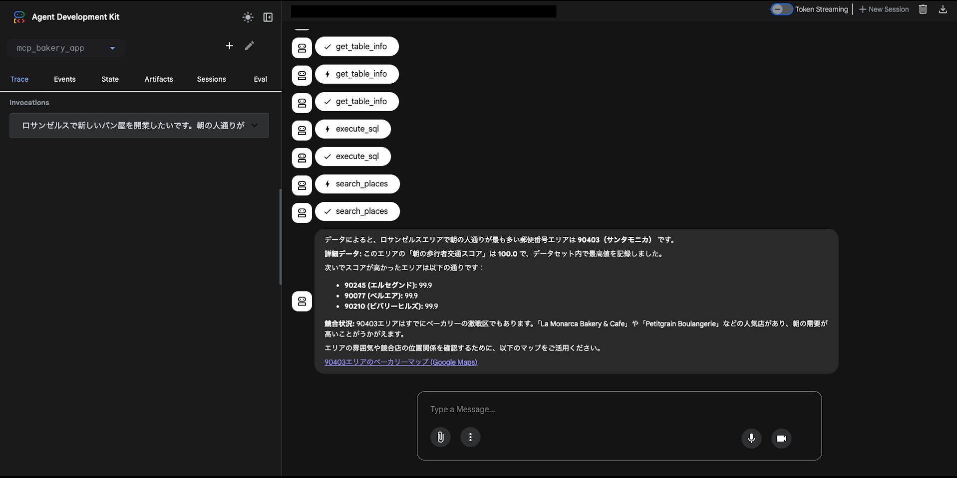 このデモは、ロサンゼルスでパン屋を開業するために、BigQuery(社内データ) と Google Maps(外部データ) をエージェントが使い分けて最適な場所を提案してくれるというものです。