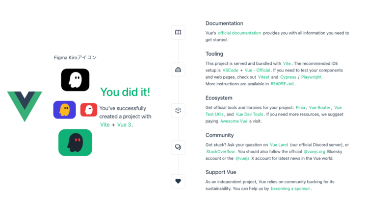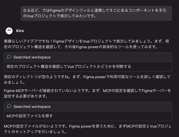 上記はKiroに聞いてみた結果です。使用例にあるデザイン→コード変換はAmplify Studioで提供されていた機能に似ているような気がしますね。ということで今回はFigmaで作成したコンポーネントをVueのプロジェクトにコード化してコンポーネントとして使用してみたいと思います。