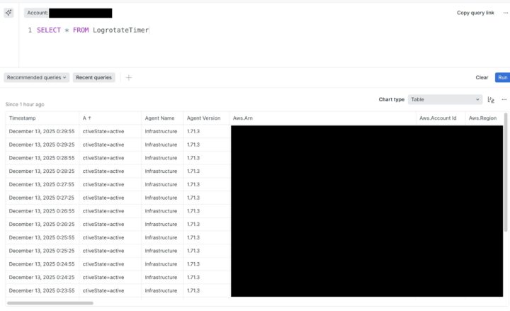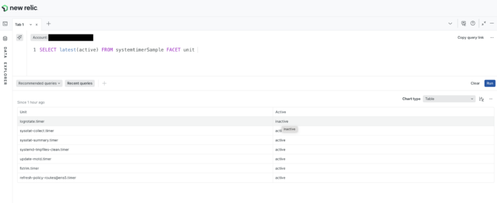 New Relicの管理画面でクエリ(NRQL)を投げて確認します。以下のようにテーブル形式で各タイマーのステータス(Active/Inactive)が取得できていれば成功です!