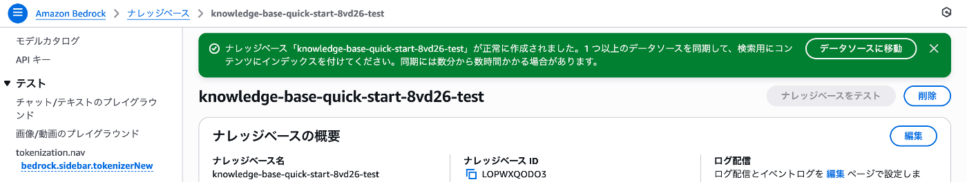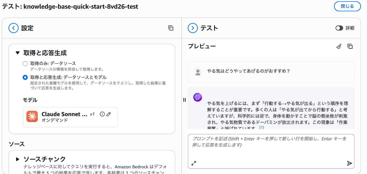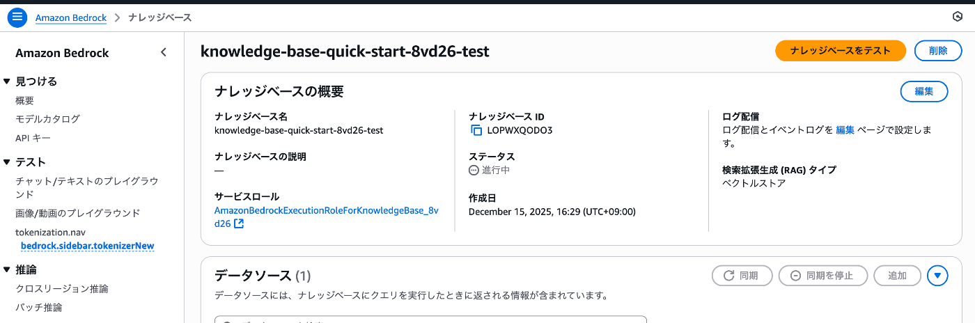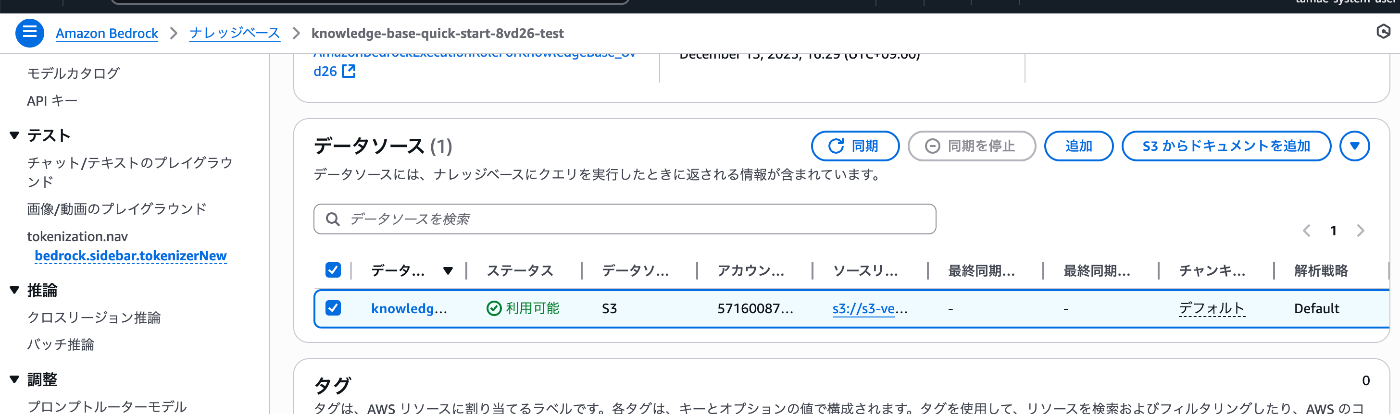 同期が完了すると、これでS3 Vectorsが使えるようになったので、Bedrockでテストをして行きます。