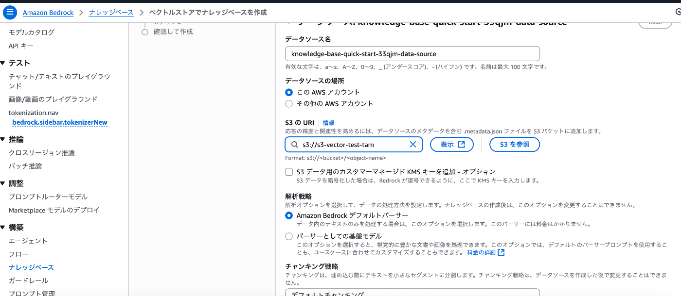 - AWSコンソールでAmazon Bedrockの画面を開き、「Knowledge Bases」を作成します。