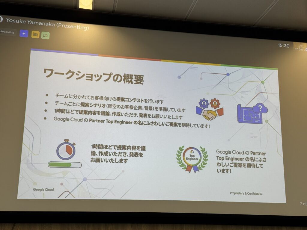 LTの後は、あらかじめ決められたグループごとで3つの部屋に分かれてワークショップを行いました。このワークショップの目的は「自分が思いつかなかったような観点に気づきを得て今後の活動に活かす」でした。私がいたグループ18のテーマは〜というものでした。ワークショップ中はグループのメンバーで意見を出し合いながら本質的に課題は何かディスカッションしたり、どのサービスが最適かなどを決めました。その際に参加者全員がPTEということでPTEならではのハイクオリティなディスカッションに参加ができ、新しい学びがたくさんありました。特にお客様の課題をはっきりさせるためのプロセスはとても勉強になりました。特に学びになったと感じた点は、現状、挙げられている課題の背景を考えることです。そうすることで「〜ということが本質的な課題なのでは?」という仮説を立てることができ、それを解決するために適切なGoogle Cloudのサービスを選定できました。そして最後にディスカッションして決まった解決策を発表して、各部屋で優勝チームを決めて、優勝チームは懇親会で行われる決勝戦に進みます。