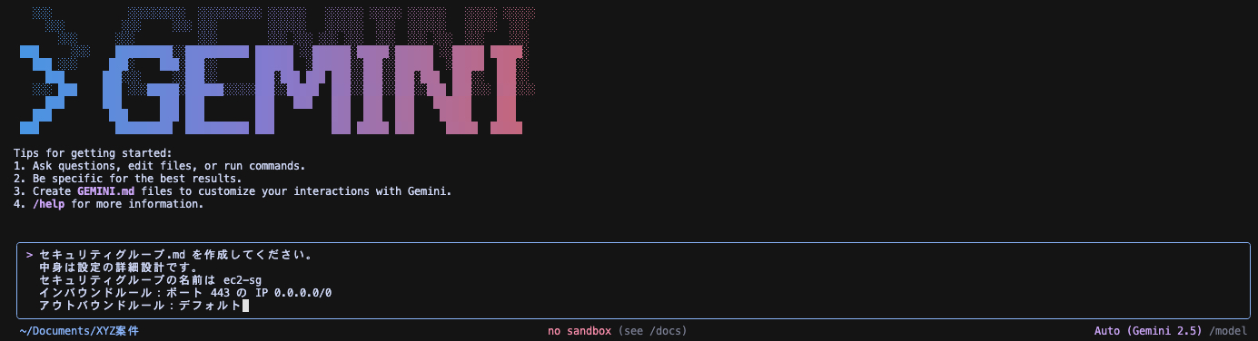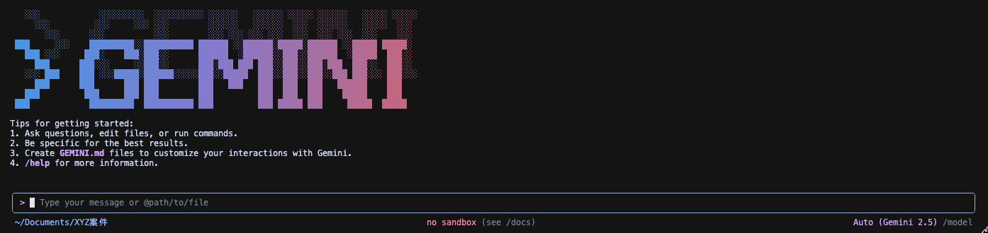 あらかじめ作成しておいた、/Users/<名前>/Documents/XYZ案件 で Gemini CLI を立ち上げます。