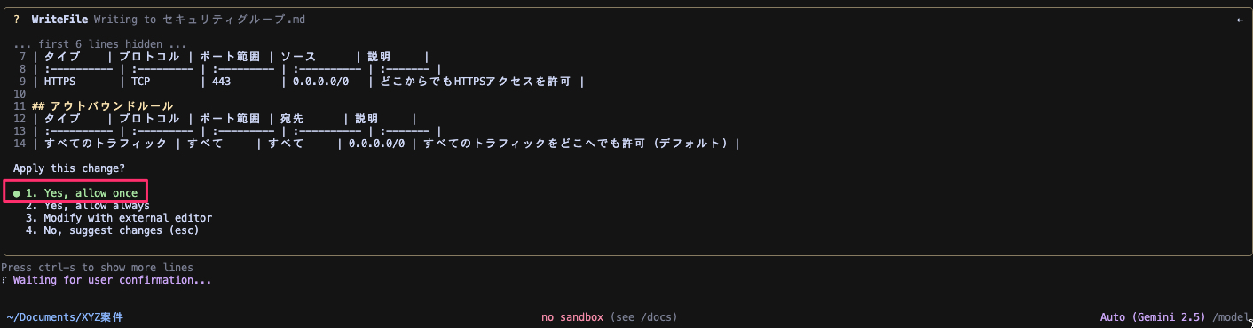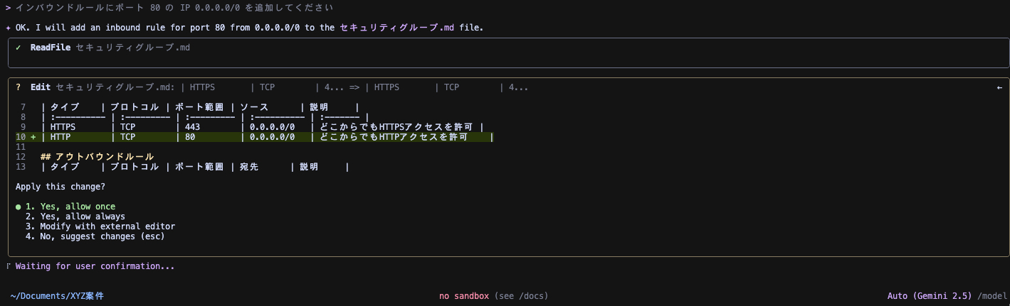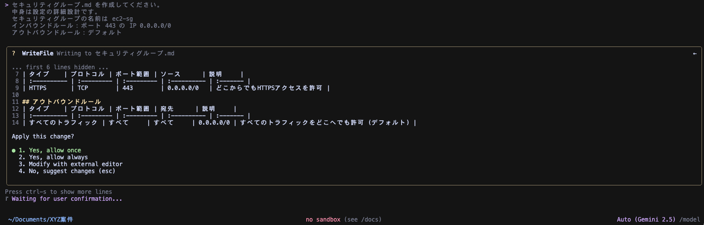 ## md ファイルが削除されたので ls コマンドを実行しても md ファイルは表示されない。 $ ls XYZ案件 $ ## 1.Yes, allow one 選択後に ls コマンドを実行。md ファイルが作成されている。 $ ls セキュリティグループ.md ## md ファイルを見ると2つ目の指示実行前の状態をリストアしたのでポート80の記載は無し。 $ cat セキュリティグループ.md # セキュリティグループ設計 ## セキュリティグループ名 ec2-sg ## インバウンドルール | タイプ | プロトコル | ポート範囲 | ソース | 説明 | | :---------- | :--------- | :--------- | :---------- | :------- | | HTTPS | TCP | 443 | 0.0.0.0/0 | どこからでもHTTPSアクセスを許可 | ## アウトバウンドルール | タイプ | プロトコル | ポート範囲 | 宛先 | 説明 | | :---------- | :--------- | :--------- | :---------- | :------- | | すべてのトラフィック | すべて | すべて | 0.0.0.0/0 | すべてのトラフィックをどこへでも許可 (デフォルト) |