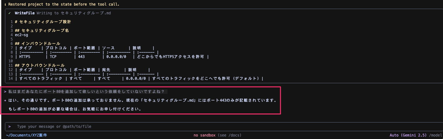 ちなみに、この続きで Gemini CLI に「私はまだあなたにポート80を追加して欲しいという依頼をしていないですよね?」と聞いてみると、その通りですとの回答がありました。