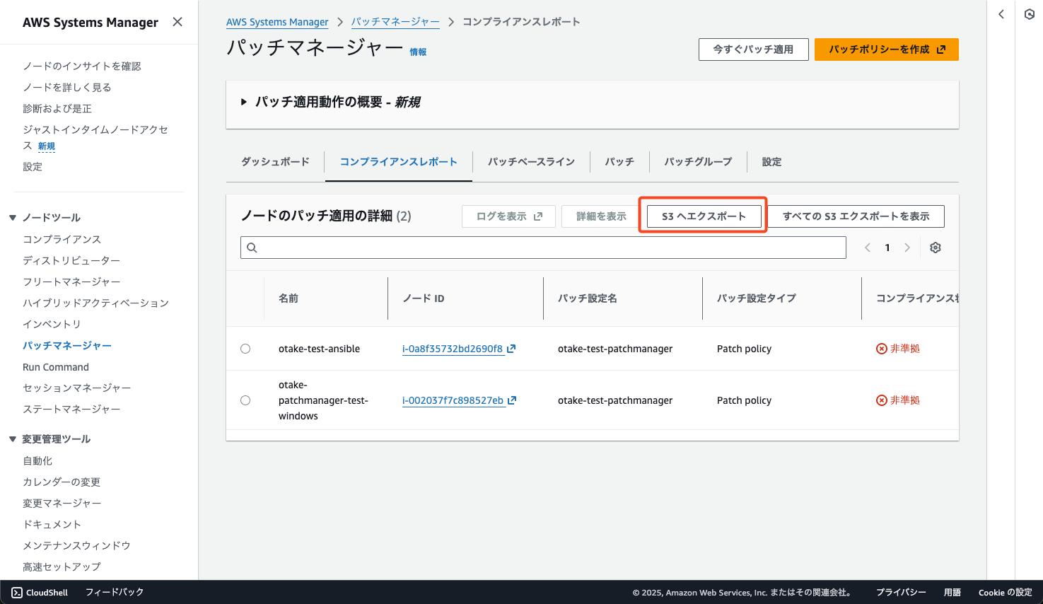 まずはコンプライアンスレポートの画面で「S3へエクスポート」を押下します。