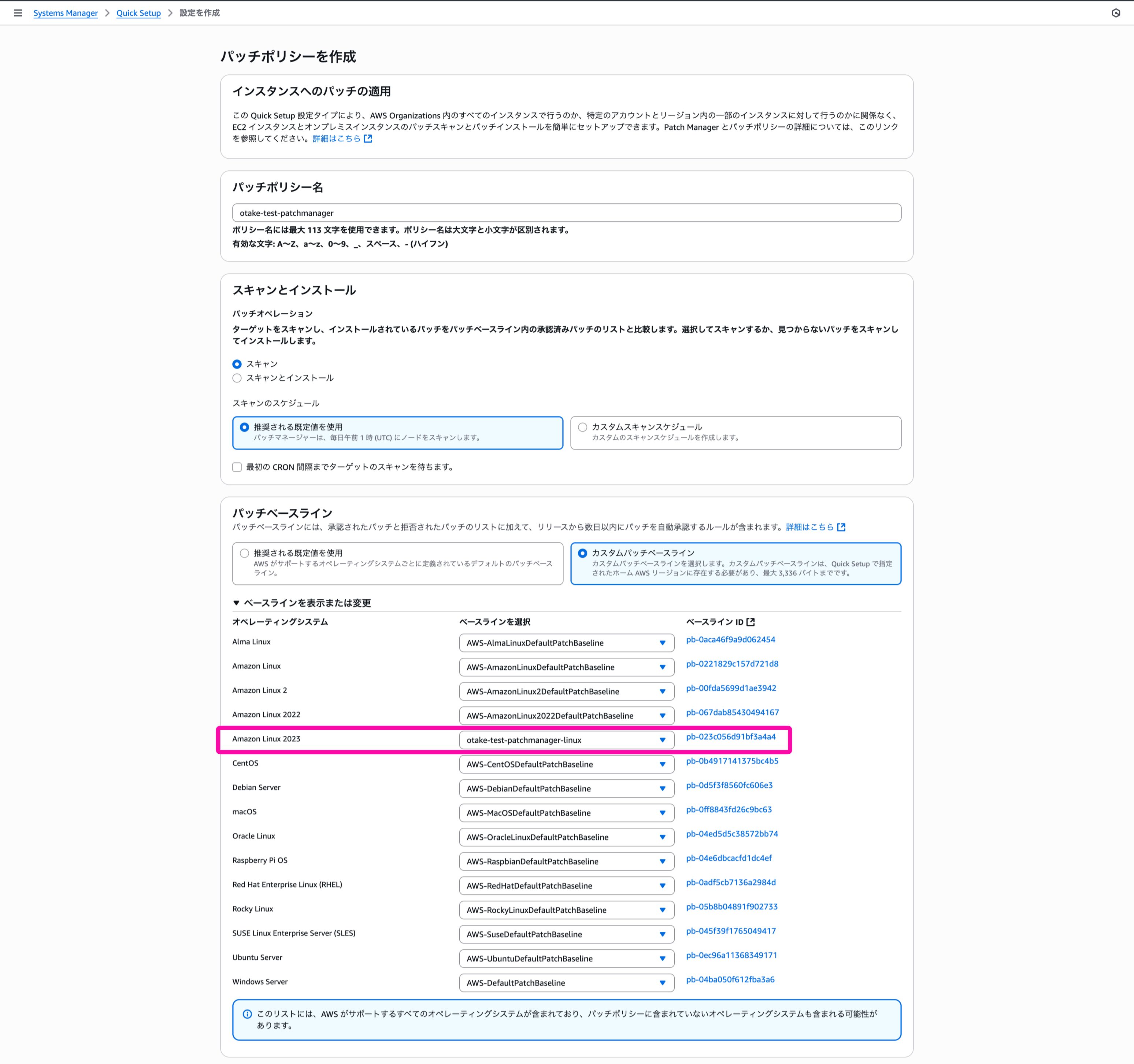 まずは名前と作成したAL2023のパッチベースラインを選択しておきます。