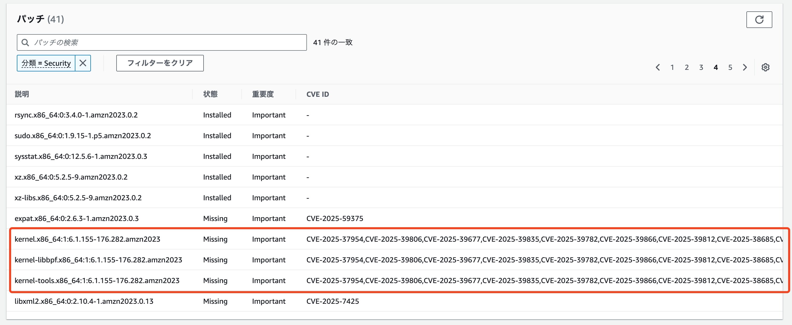 CVE情報も出しつつ状態はMissingとして警告してくれています。