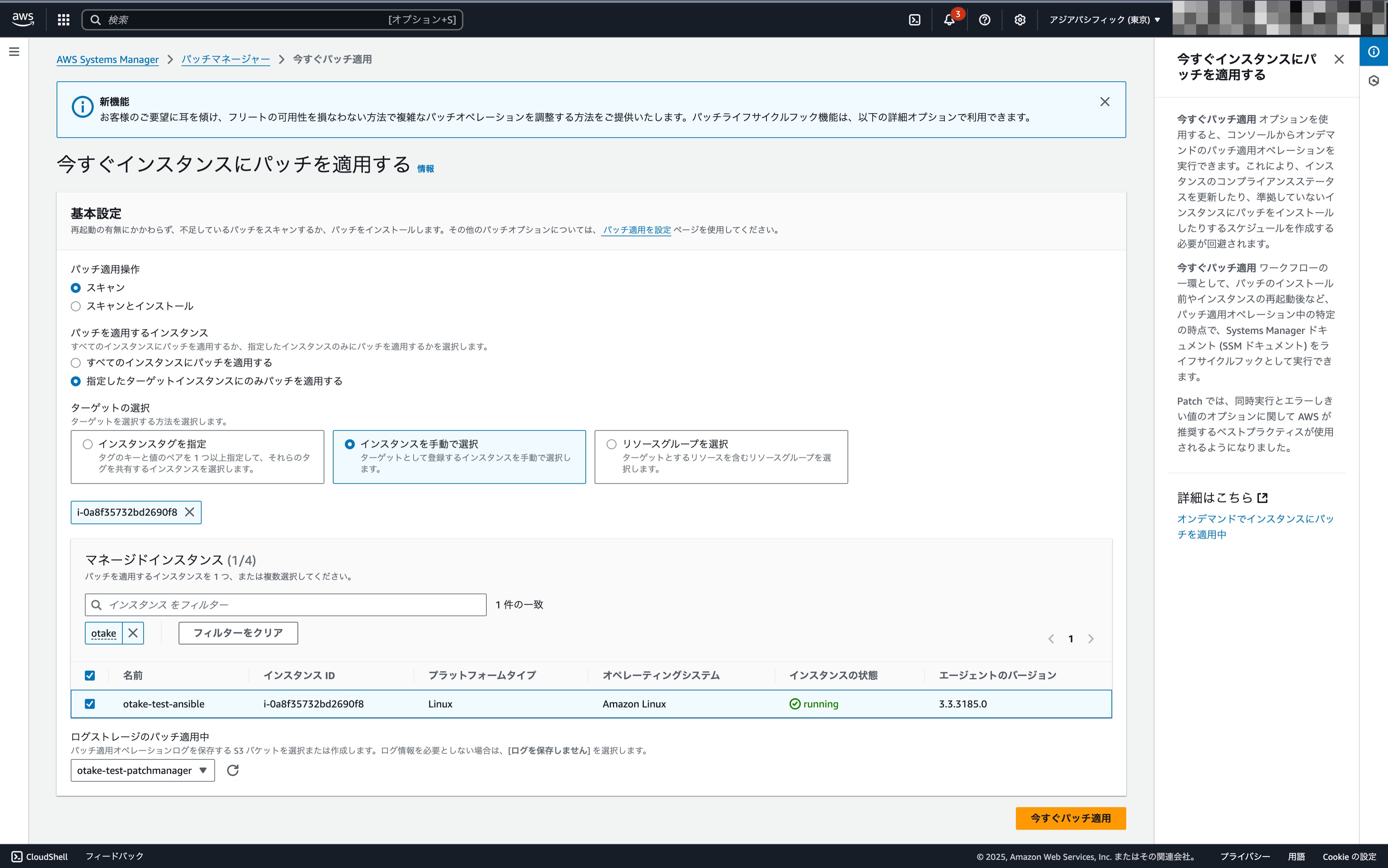 「今すぐインスタンスにパッチを適用する」からスキャンを選択します。