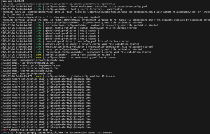 aws-vault exec <profile-name> -- docker run --rm -it \ -e AWS_ACCESS_KEY_ID \ -e AWS_SECRET_ACCESS_KEY \ -e AWS_SESSION_TOKEN \ -v "$(pwd)/landing-zone-accelerator-on-aws-release-v1.13.1/source:/app/source" \ -v "$(pwd)/aws-accelerator-config:/app/config:ro" \ -v "$(pwd)/config-creator/validate.sh:/app/validate.sh" \ lza-validator \ bash /app/validate.sh