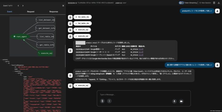 また、ADKとMCPを組み合わせる利点として、エージェントがチャットの意図を理解し、MCP側で定義されたスキーマに基づいてデータを取得・整形してくれる点が挙げられます。これにより構造化されたデータが保証されるため、ハルシネーションや予期せぬエラーが減り、期待通りの結果を安定して得ることができます。