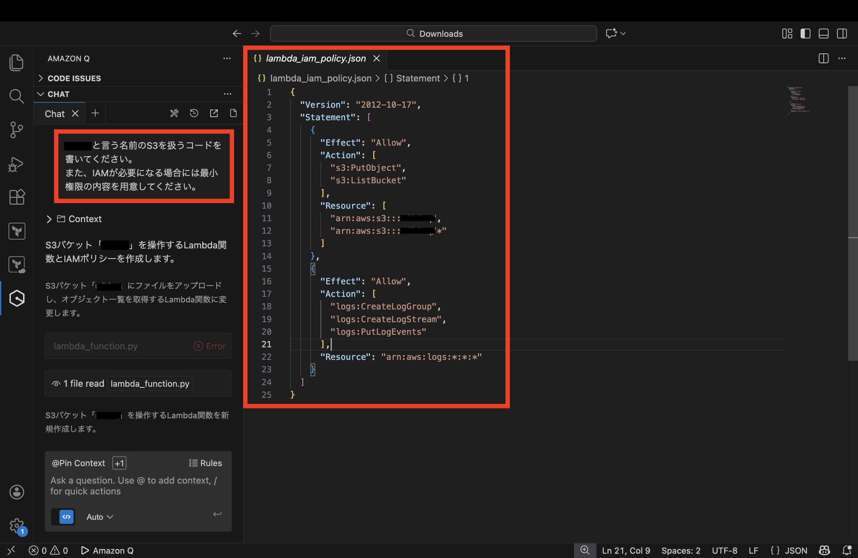 以下のように依頼したところ、最小権限の IAM ポリシーが作成されました。