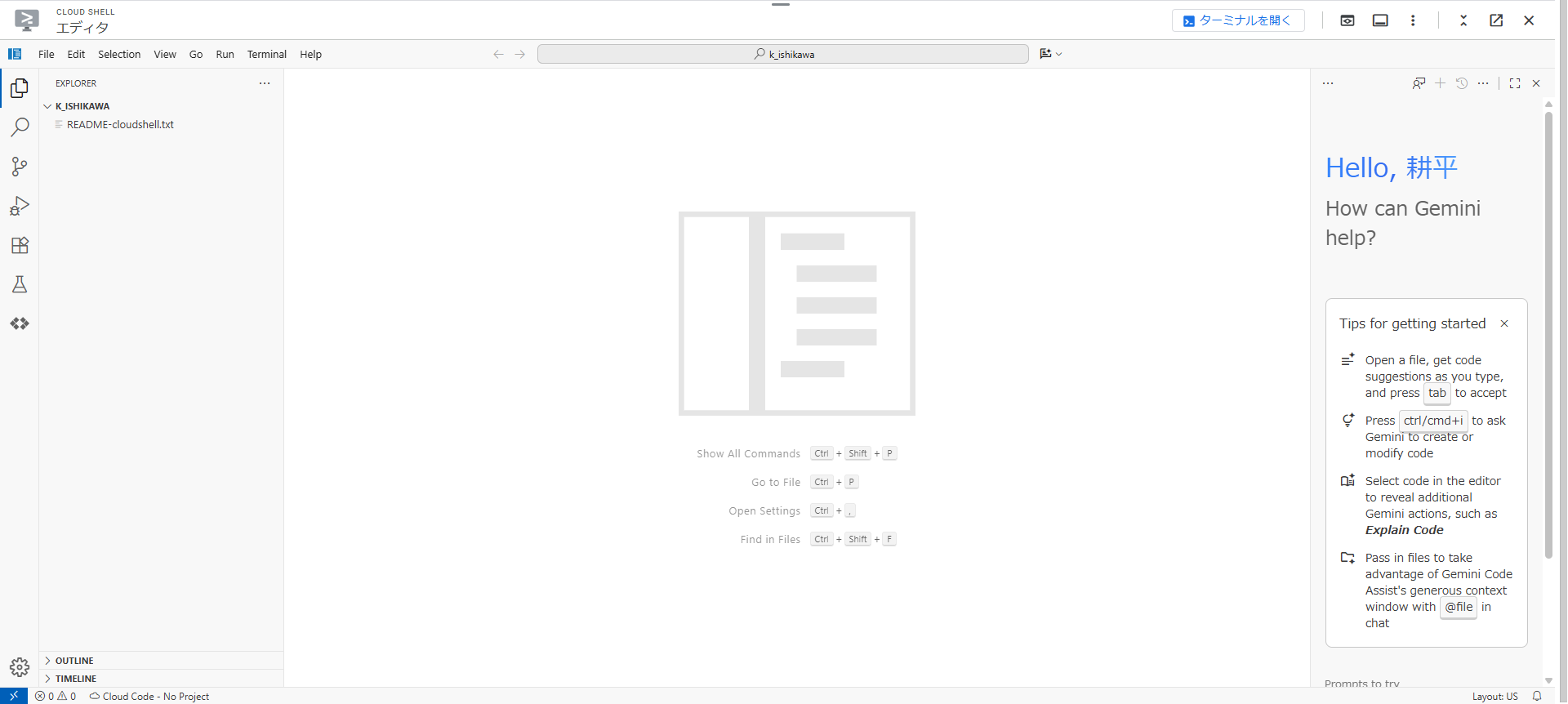 - Google Cloud の Cloud Shell エディタ 上でソース配置したり、コマンド実行して動作確認する