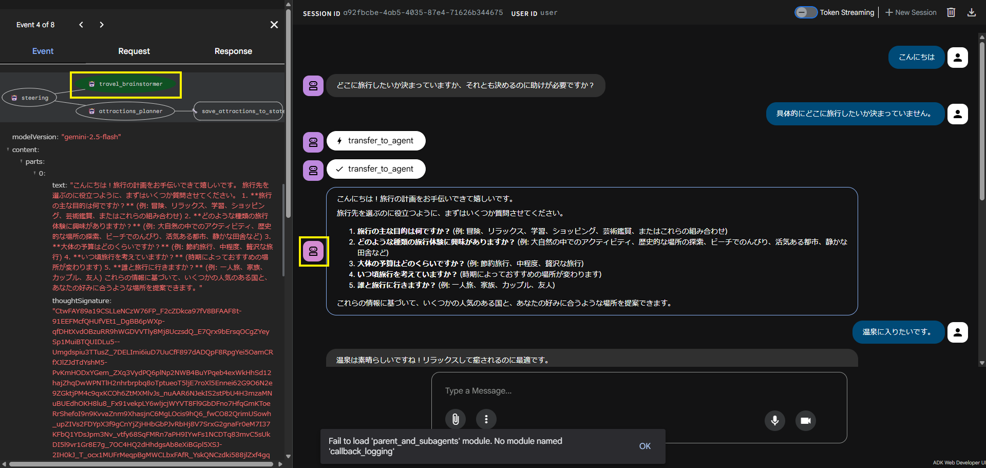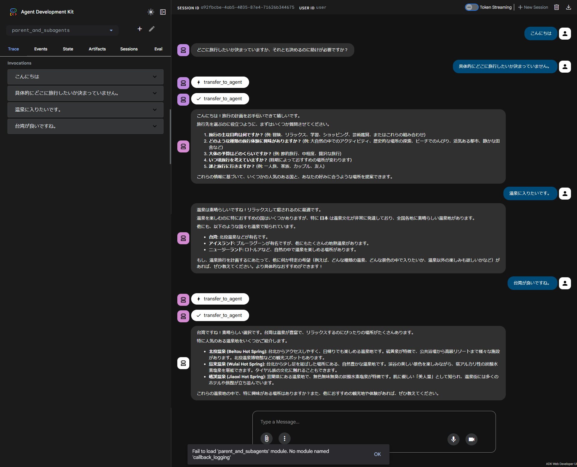 - 下記入力して、エージェント「travel_brainstormer」とやり取りします。